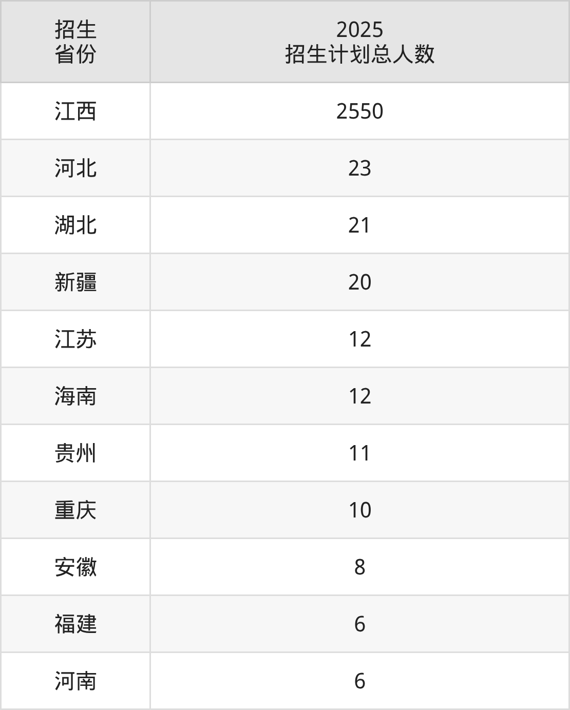 2025年景德镇学院面向全国11个省市开展本科招生;招生专业共26个,招生人数共2679人。2025年在江西省招生计划总人数是2550人,其中,景德镇学院在江西省招生人数最多的是机械设计制造及其自动化。景德镇学院在各省具体招生人数情况如下表。
