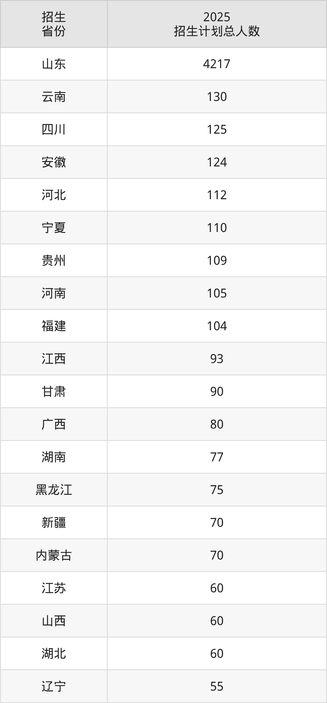 2025年山东财经大学面向全国28个省市开展本科招生;招生专业共38个,招生人数共6216人。2025年在山东省招生计划总人数是4217人,其中,山东财经大学在山东省招生人数最多的是会计学。山东财经大学在各省具体招生人数情况如下表。