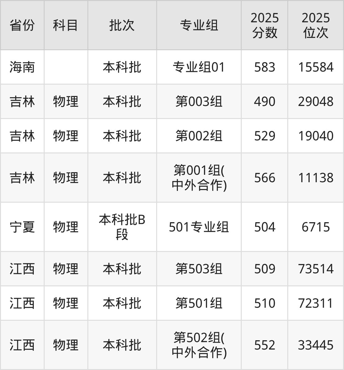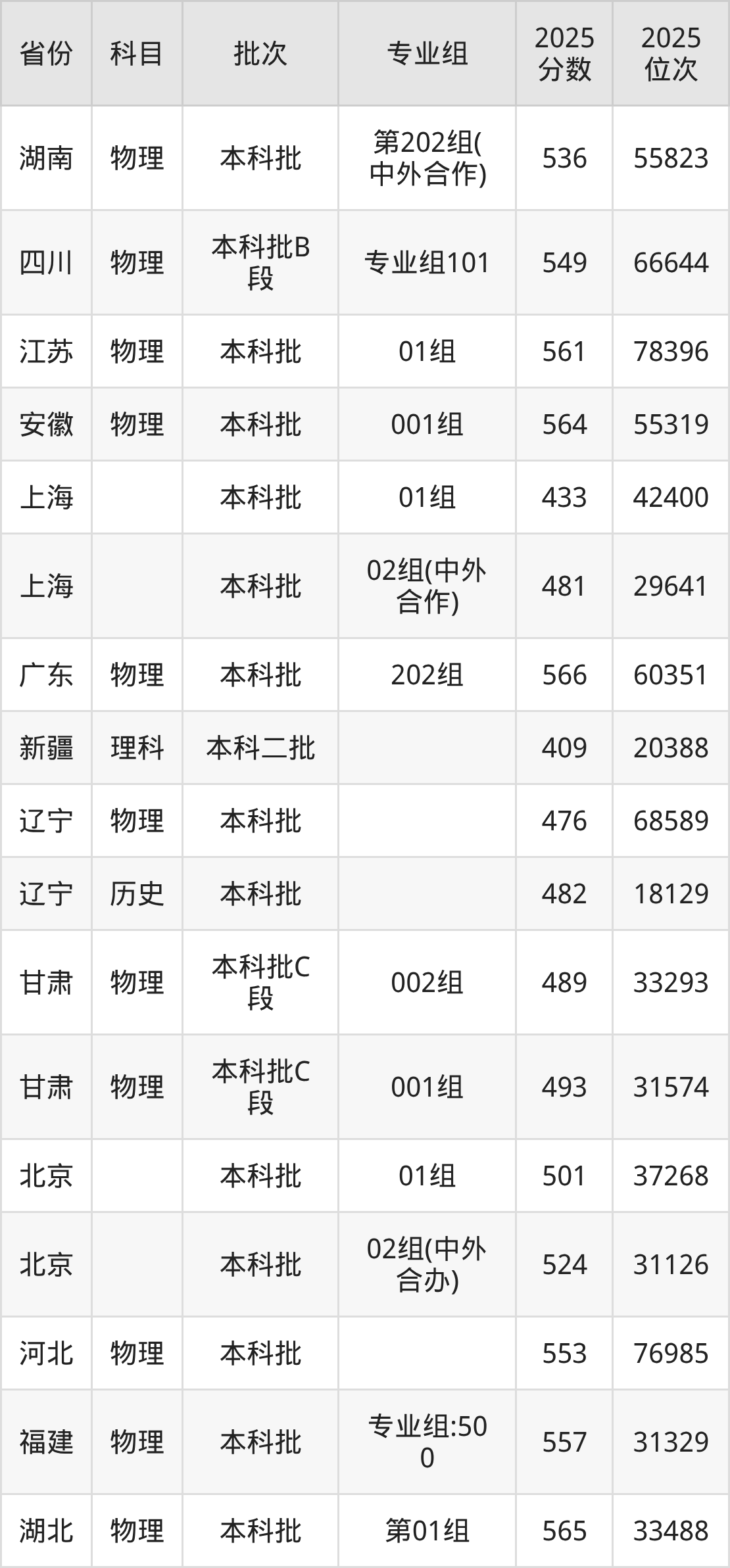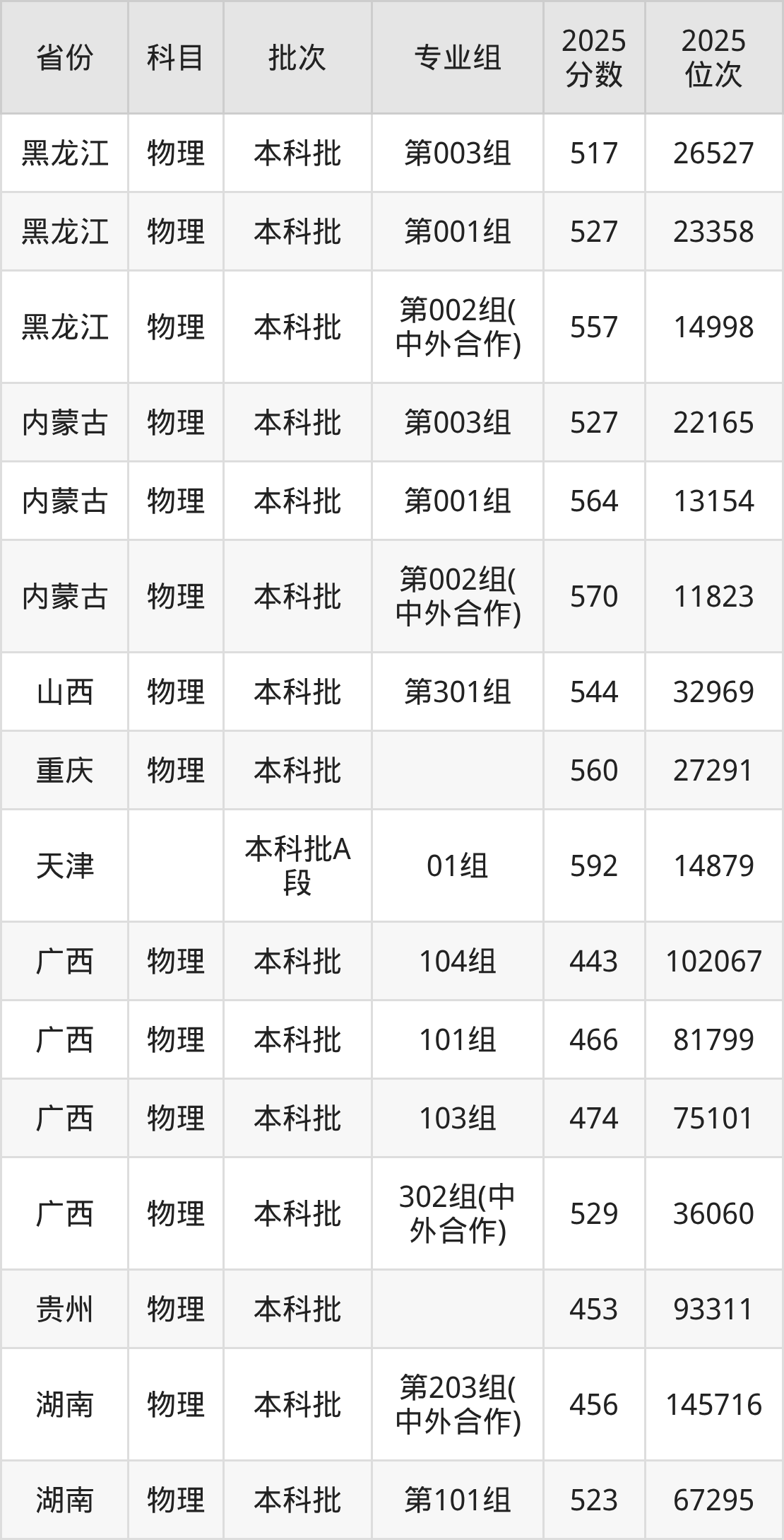 2025年在本科物理类进行招生,各专业组分数线详情如下:
