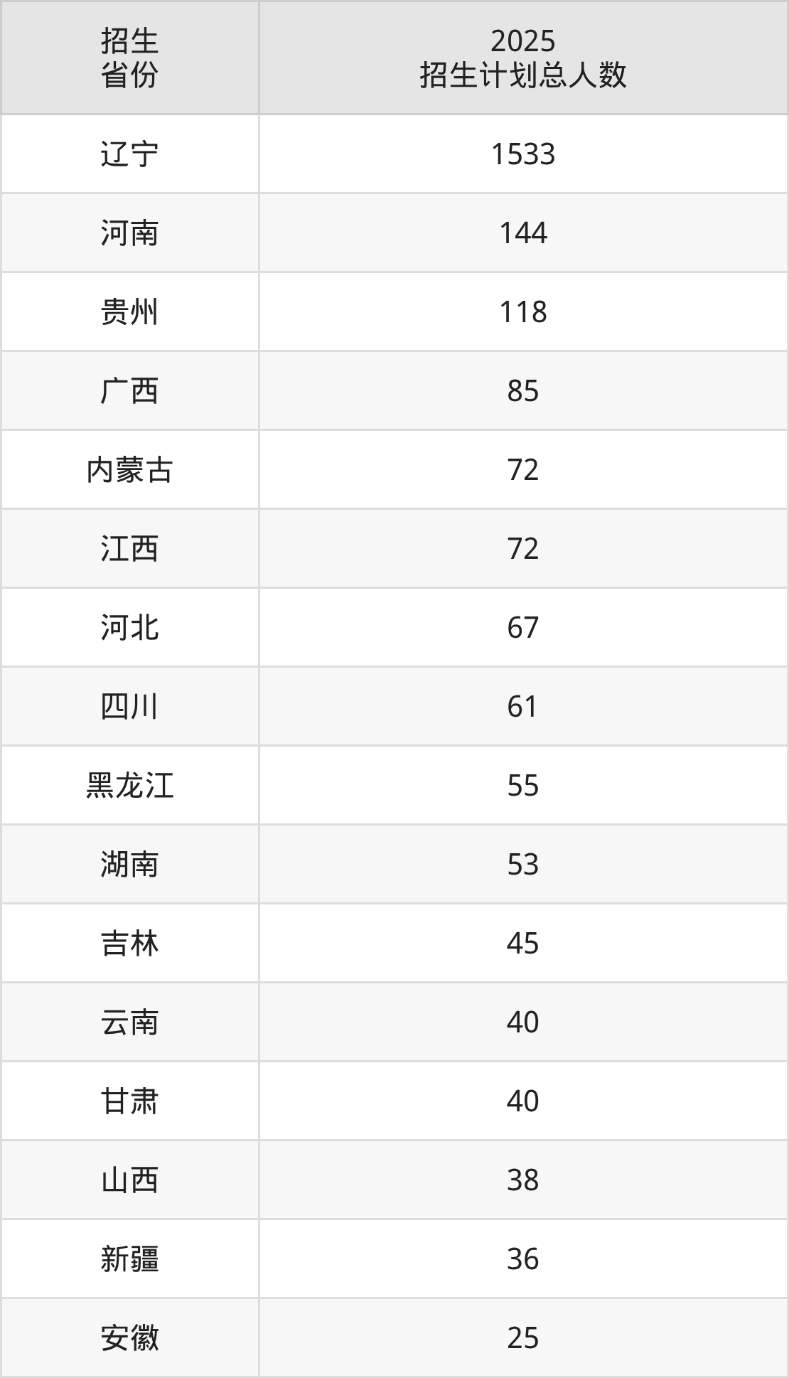 2025年沈阳工程学院面向全国28个省市开展本科招生;招生专业共33个,招生人数共2252人。2025年在辽宁省招生计划总人数是1533人,其中,沈阳工程学院在辽宁省招生人数最多的是发电厂及电力系统。沈阳工程学院在各省具体招生人数情况如下表。
