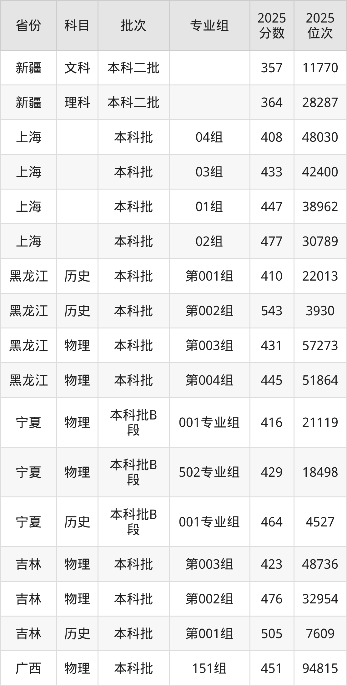 2025年投档录取最低分为364分,录取最低位次为28287名。