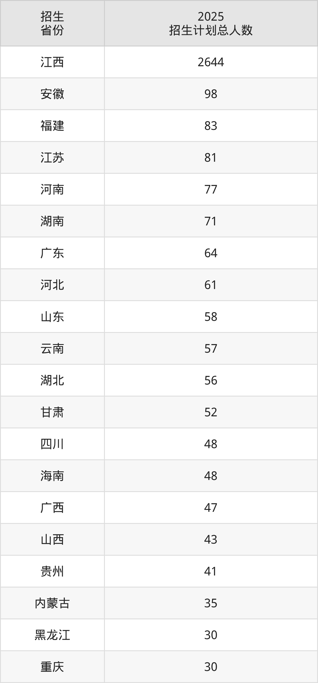 2025年江西科技师范大学面向全国28个省市开展本科招生;招生专业共46个,招生人数共3851人。2025年在江西省招生计划总人数是2644人,其中,江西科技师范大学在江西省招生人数最多的是数学与应用数学。江西科技师范大学在各省具体招生人数情况如下表。