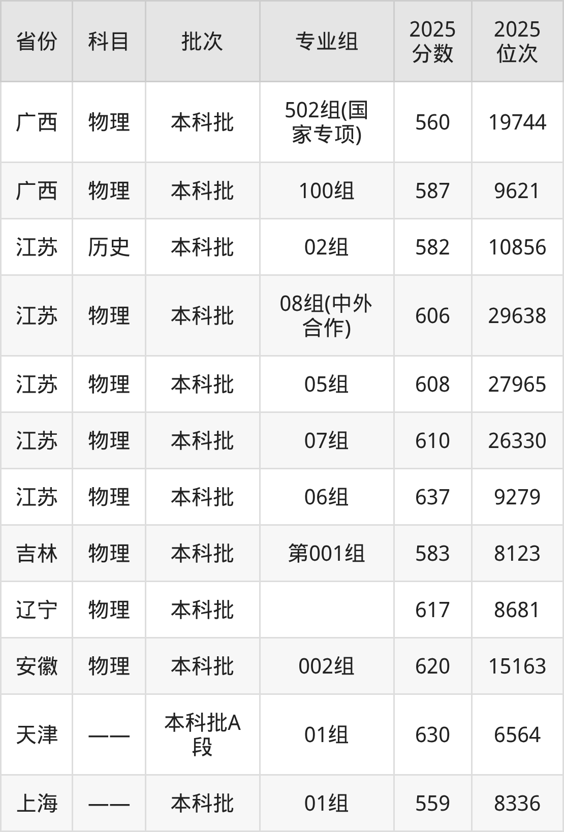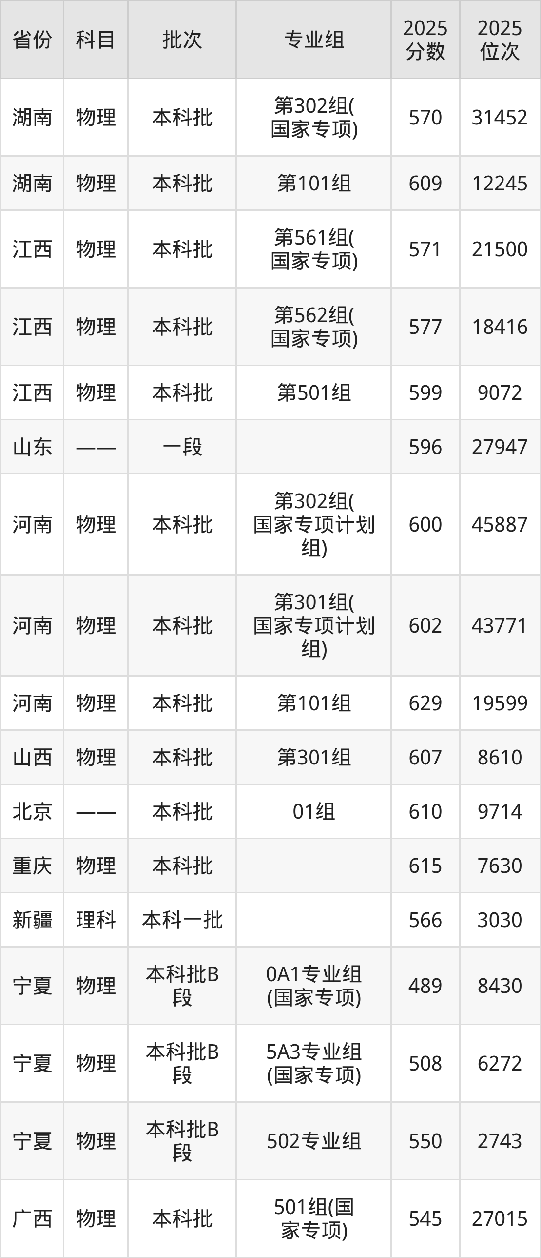 2025年在本科物理类进行招生,各专业组分数线详情如下: