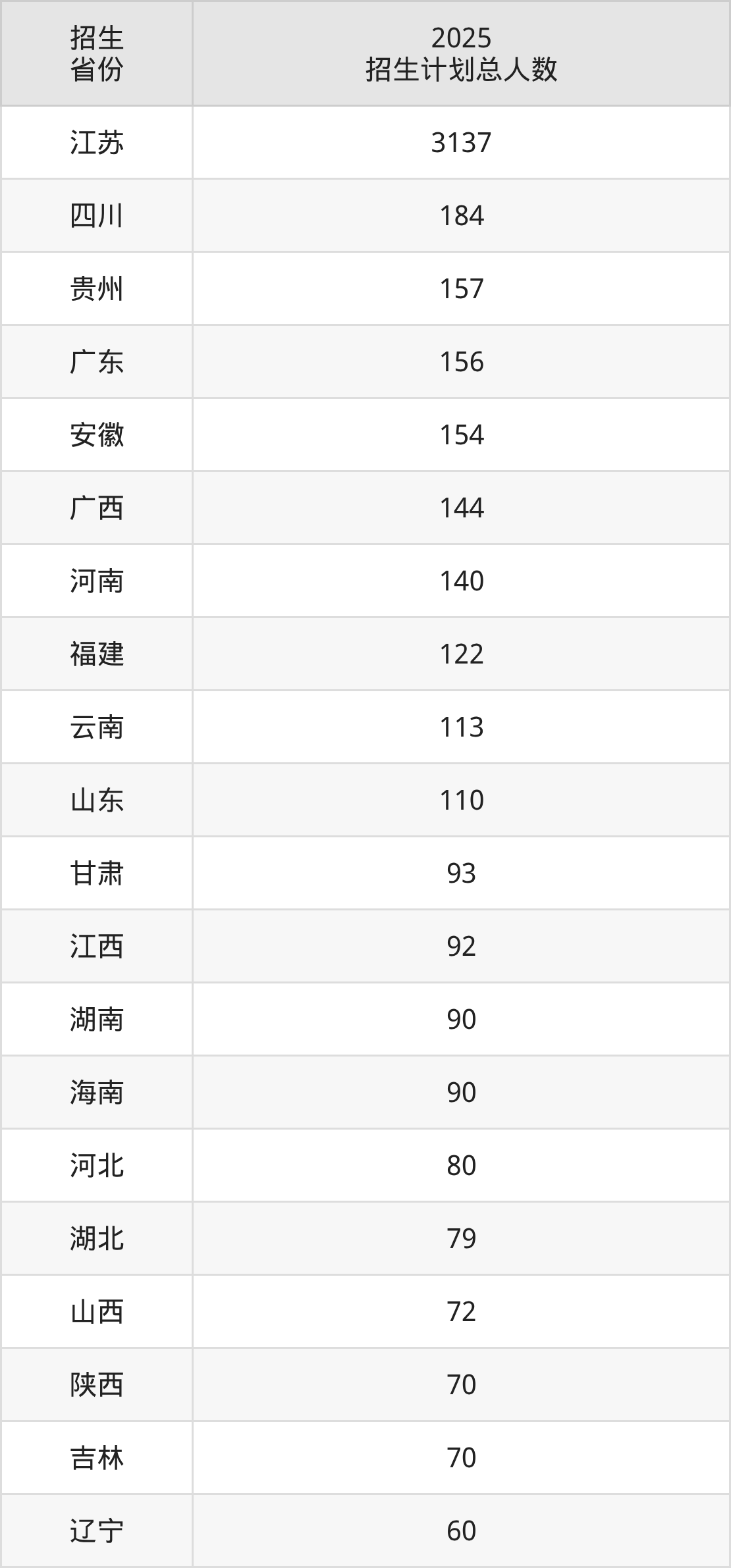2025年南京邮电大学面向全国29个省市开展本科招生;招生专业共52个,招生人数共5538人。2025年在江苏省招生计划总人数是3137人,其中,南京邮电大学在江苏省招生人数最多的是通信工程。南京邮电大学在各省具体招生人数情况如下表。