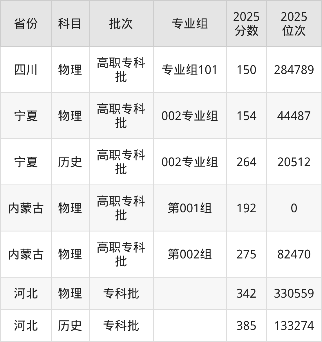 2025年在专科物理类进行招生,各专业组分数线详情如下: