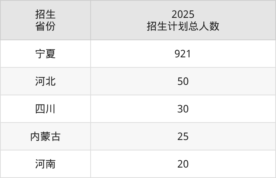 2025年石嘴山工贸职业技术学院面向全国5个省市开展专科招生;招生专业共20个,招生人数共1046人。2025年在宁夏回族自治区招生计划总人数是921人,其中,石嘴山工贸职业技术学院在宁夏回族自治区招生人数最多的是应用化工技术。石嘴山工贸职业技术学院在各省具体招生人数情况如下表。