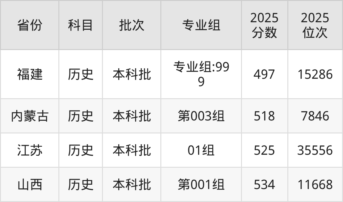 2025年在本科历史类进行招生,各专业组分数线详情如下: