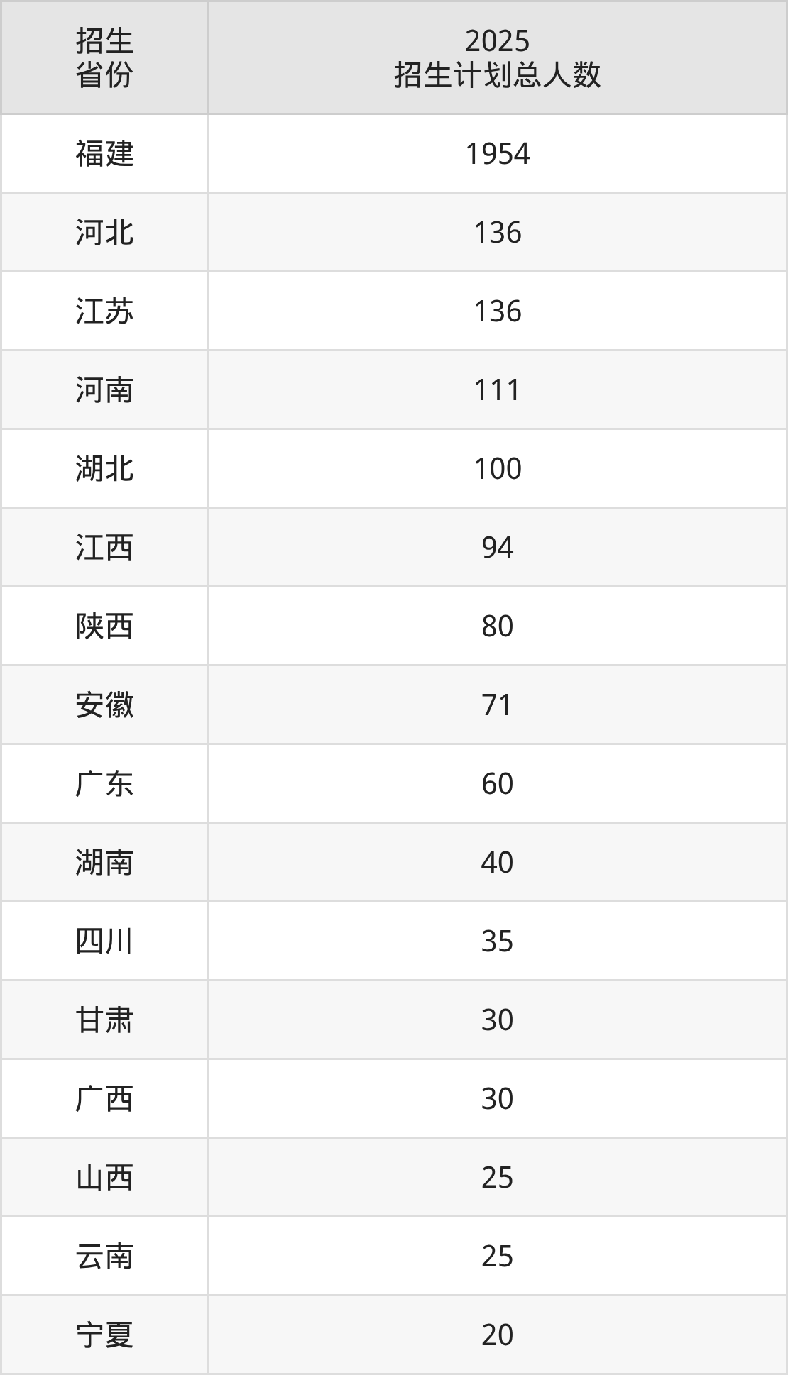 2025年福州大学至诚学院面向全国22个省市开展本科招生;招生专业共25个,招生人数共3034人。2025年在福建省招生计划总人数是1954人,其中,福州大学至诚学院在福建省招生人数最多的是电子信息工程。福州大学至诚学院在各省具体招生人数情况如下表。