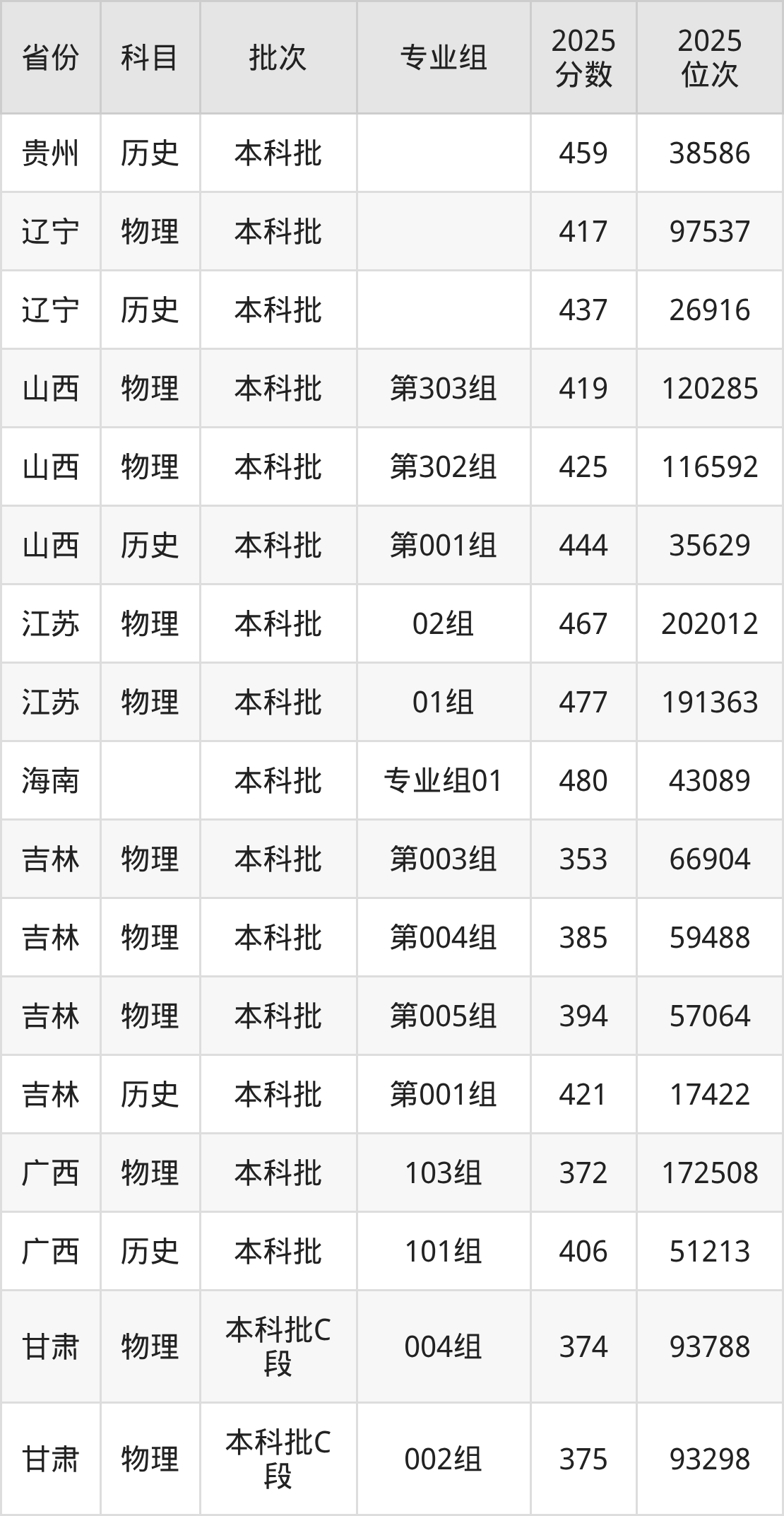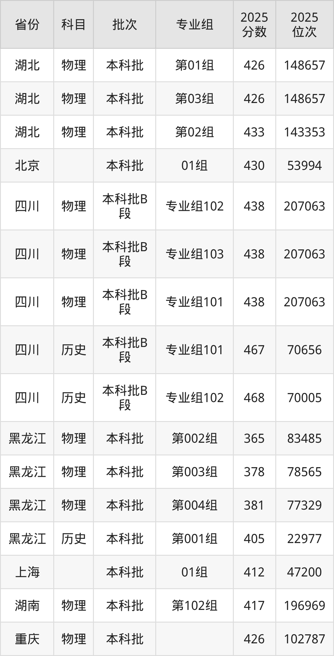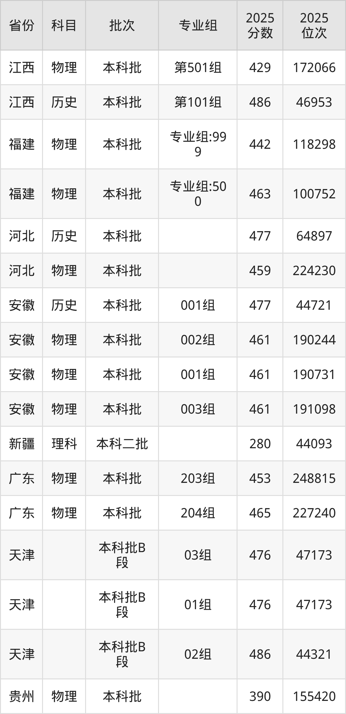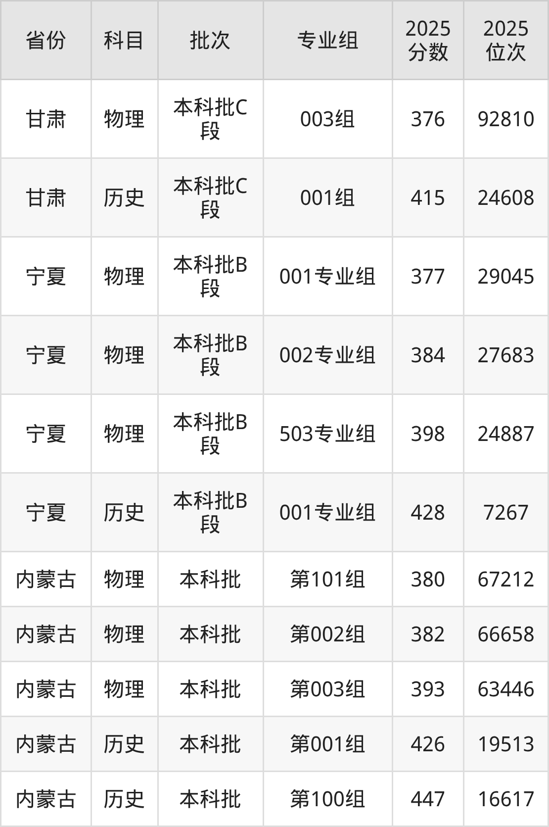 2025年在本科物理类进行招生,各专业组分数线详情如下: