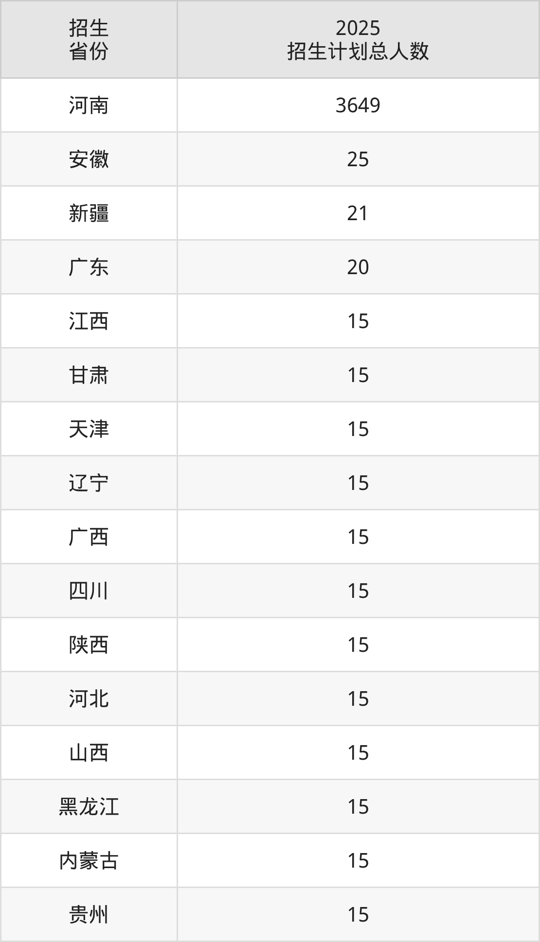 2025年河南中医药大学面向全国28个省市开展本科招生;招生专业共23个,招生人数共4025人。2025年在河南省招生计划总人数是3649人,其中,河南中医药大学在河南省招生人数最多的是中药学类。河南中医药大学在各省具体招生人数情况如下表。