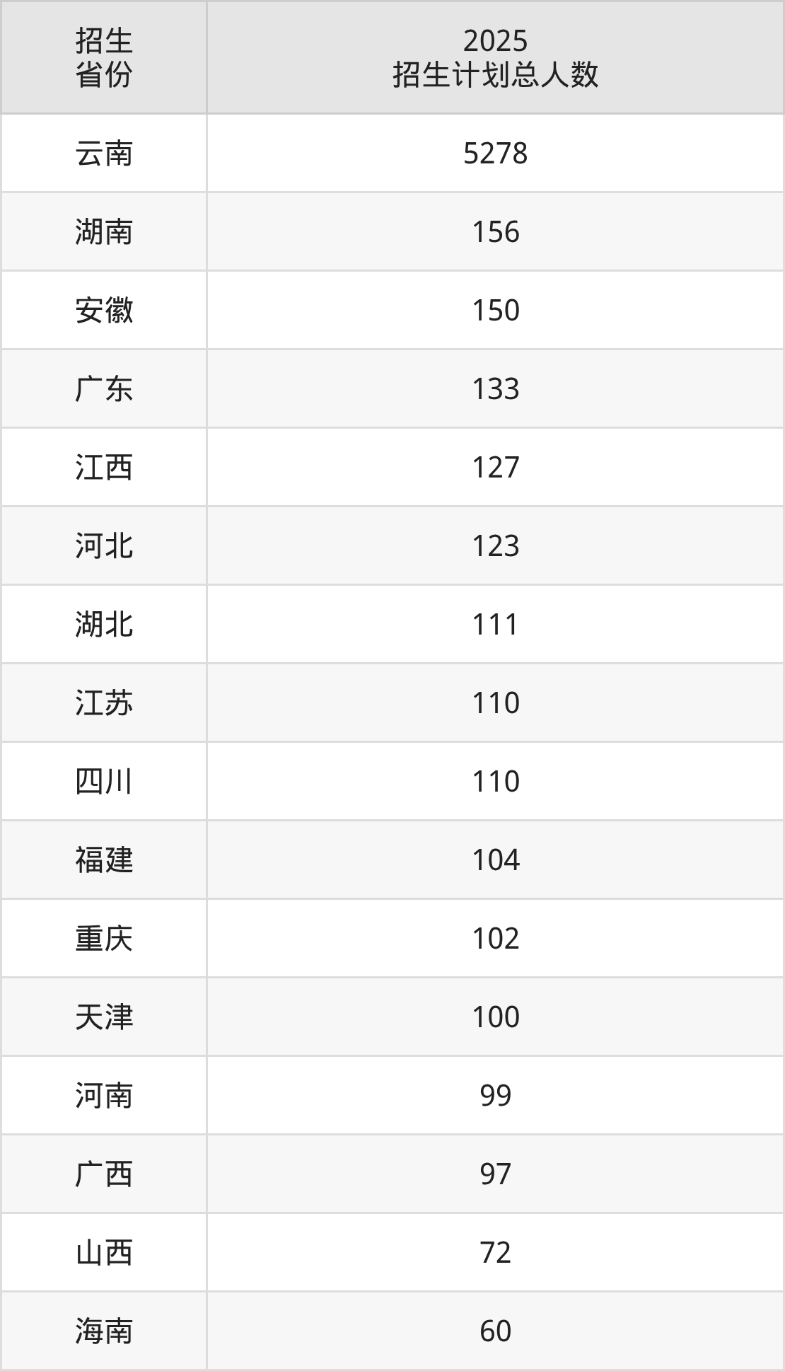 2025年云南财经大学面向全国28个省市开展本科招生;招生专业共61个,招生人数共7247人。2025年在云南省招生计划总人数是5278人,其中,云南财经大学在云南省招生人数最多的是计算机科学与技术。云南财经大学在各省具体招生人数情况如下表。