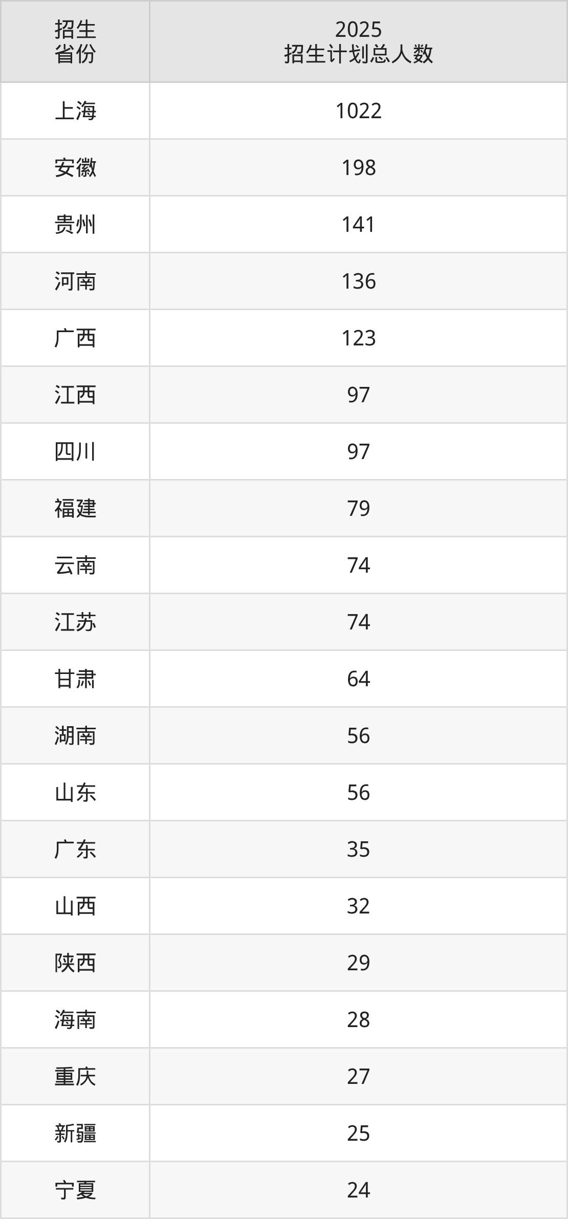 2025年华东政法大学面向全国29个省市开展本科招生;招生专业共20个,招生人数共2576人。2025年在上海市招生计划总人数是1022人,其中,华东政法大学在上海市招生人数最多的是法学。华东政法大学在各省具体招生人数情况如下表。