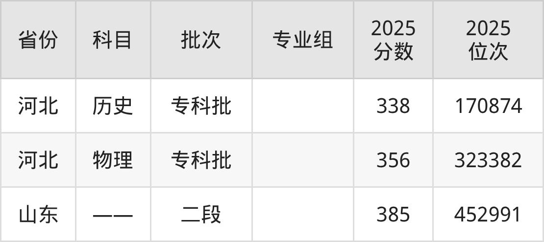 沧州职业技术学院2025招生录取分数线已公布,2025年沧州职业技术学院在河北省专科历史类投档录取最低分338分,专科物理类投档录取最低分356分。在山东省专科投档录取最低分385分,更多省份具体录取分数线详见下文。