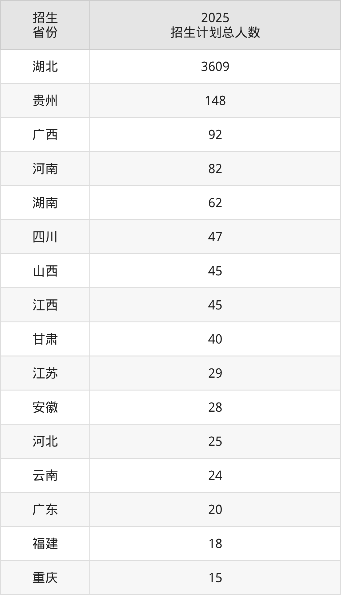 2025年湖北经济学院面向全国26个省市开展本科招生;招生专业共42个,招生人数共4419人。2025年在湖北省招生计划总人数是3609人,其中,湖北经济学院在湖北省招生人数最多的是人工智能。湖北经济学院在各省具体招生人数情况如下表。