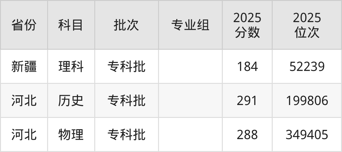2025年在专科理科进行招生,各专业组分数线详情如下: