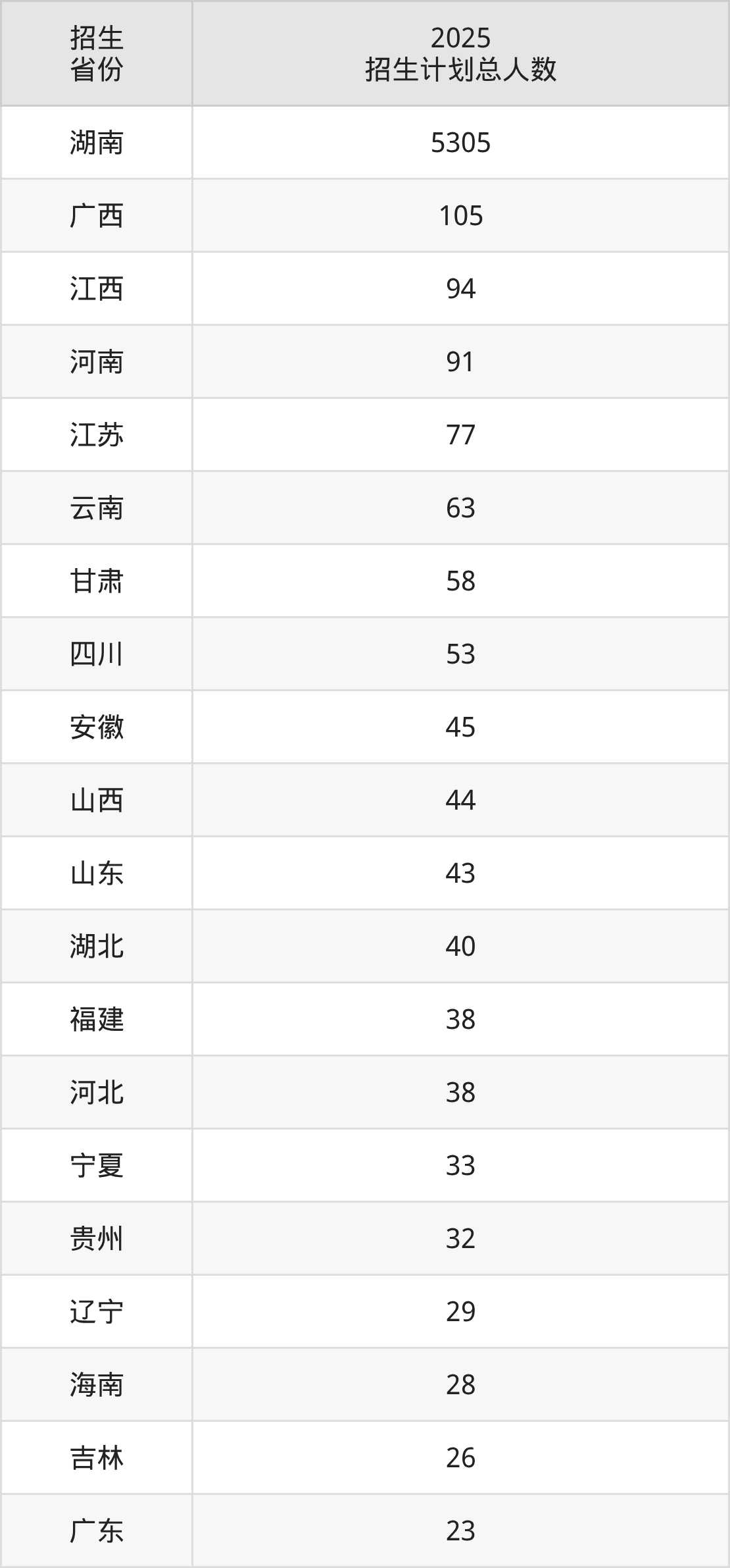 2025年湖南工商大学面向全国29个省市开展本科招生;招生专业共55个,招生人数共6394人。2025年在湖南省招生计划总人数是5305人,其中,湖南工商大学在湖南省招生人数最多的是计算机类。湖南工商大学在各省具体招生人数情况如下表。