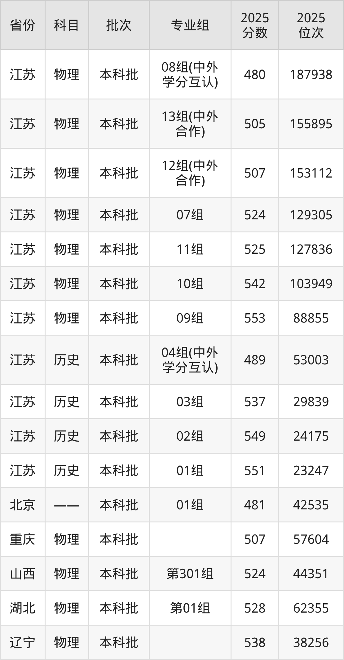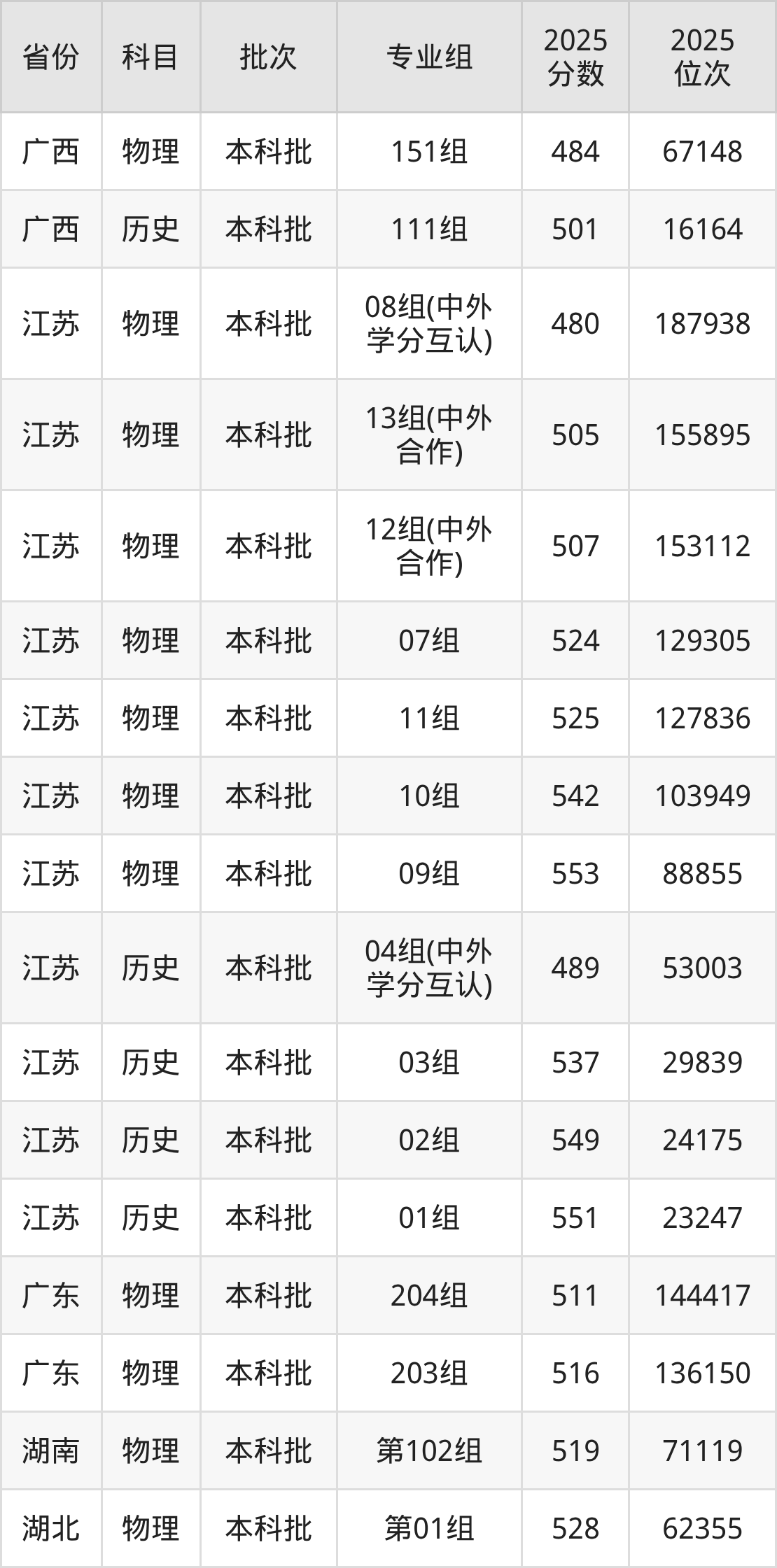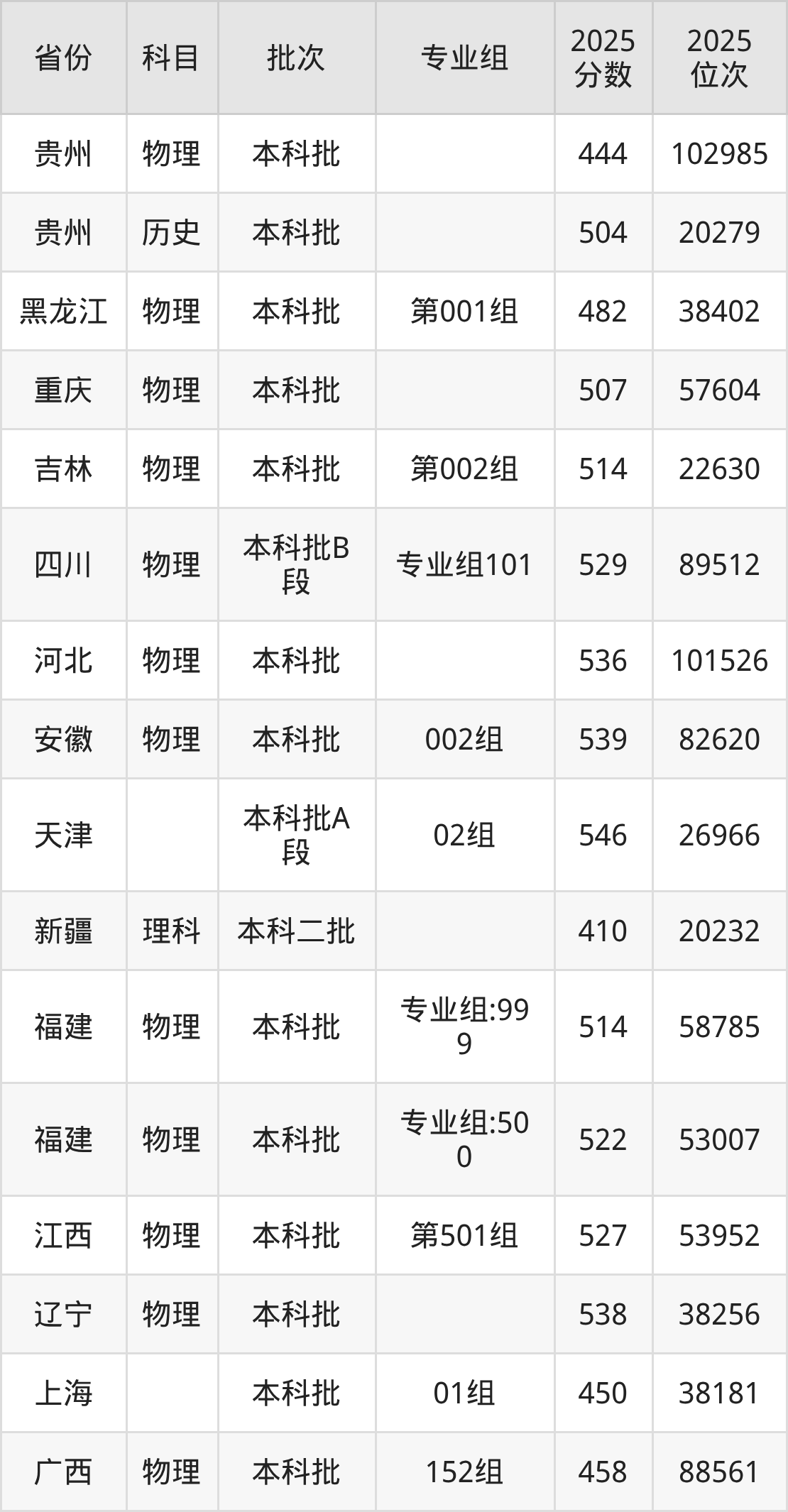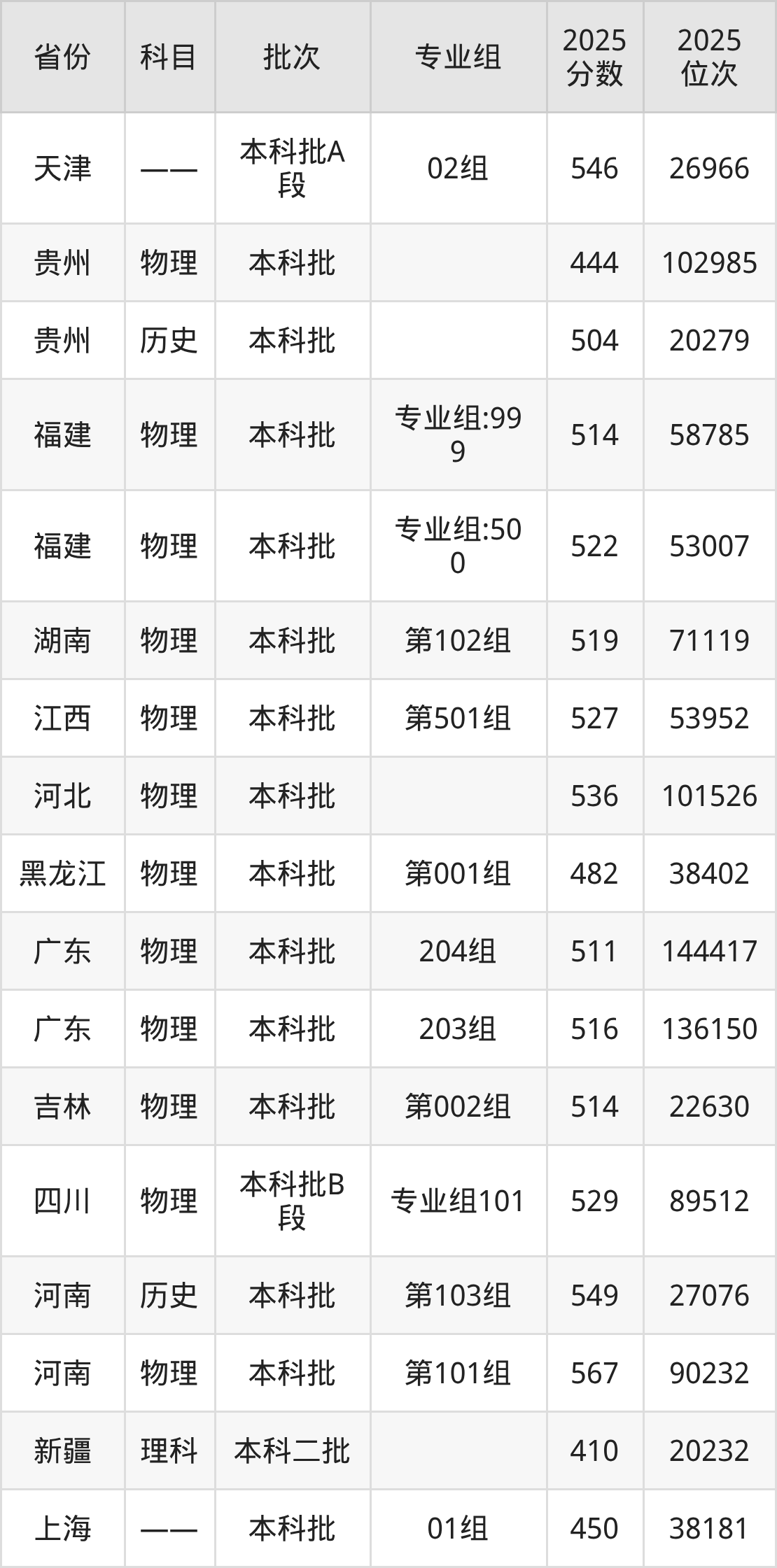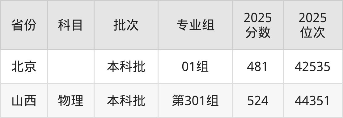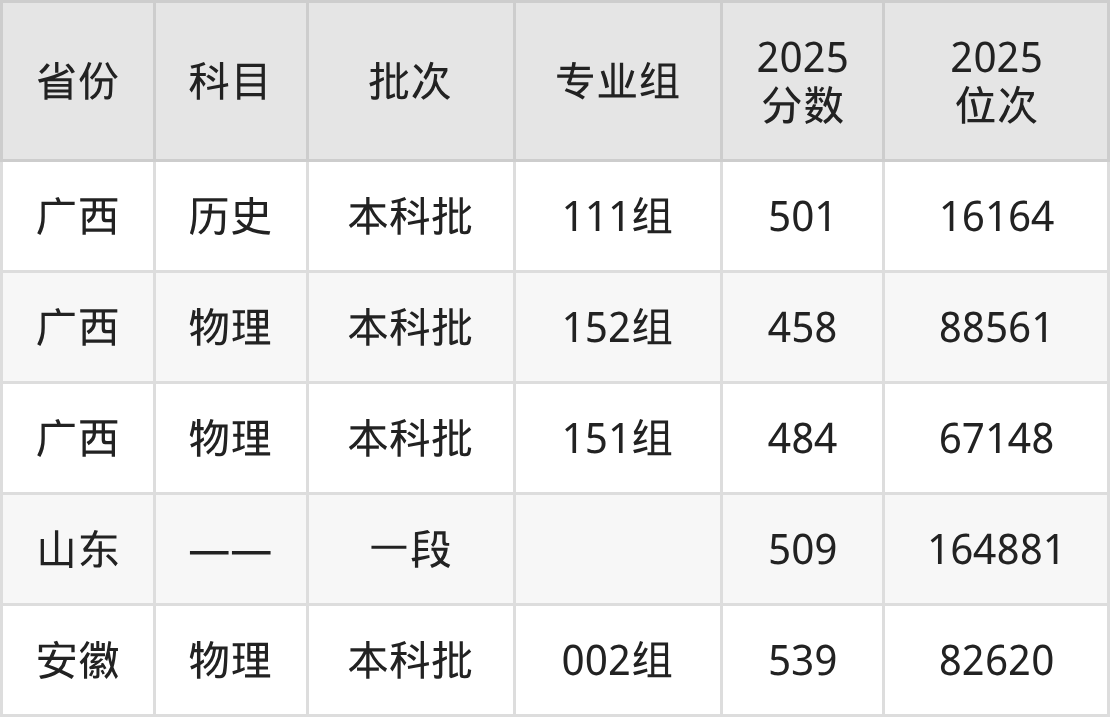 2025年在本科物理类进行招生,各专业组分数线详情如下: