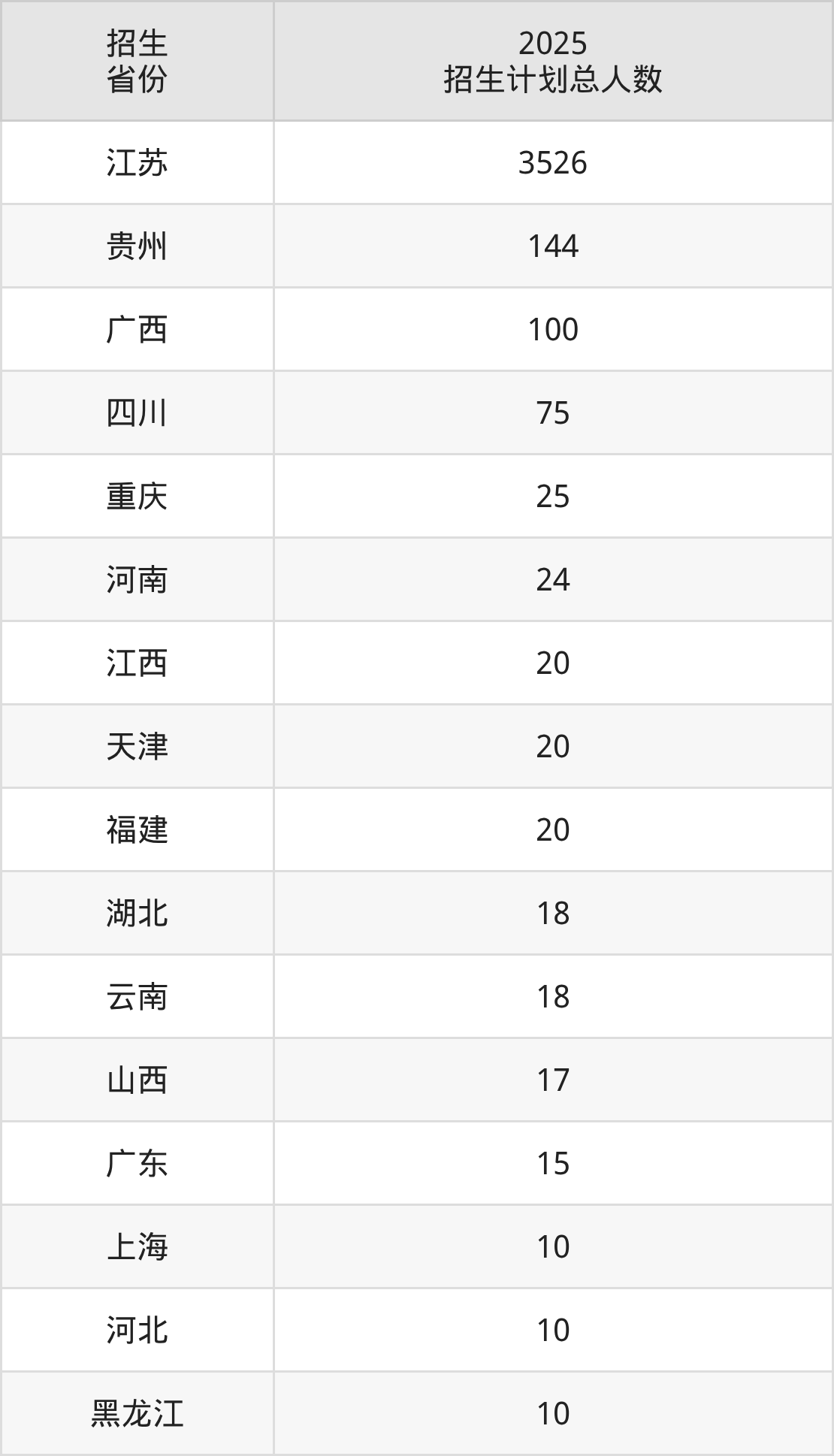 2025年常州工学院面向全国24个省市开展本科招生;招生专业共44个,招生人数共4095人。2025年在江苏省招生计划总人数是3526人,其中,常州工学院在江苏省招生人数最多的是电气工程及其自动化。常州工学院在各省具体招生人数情况如下表。