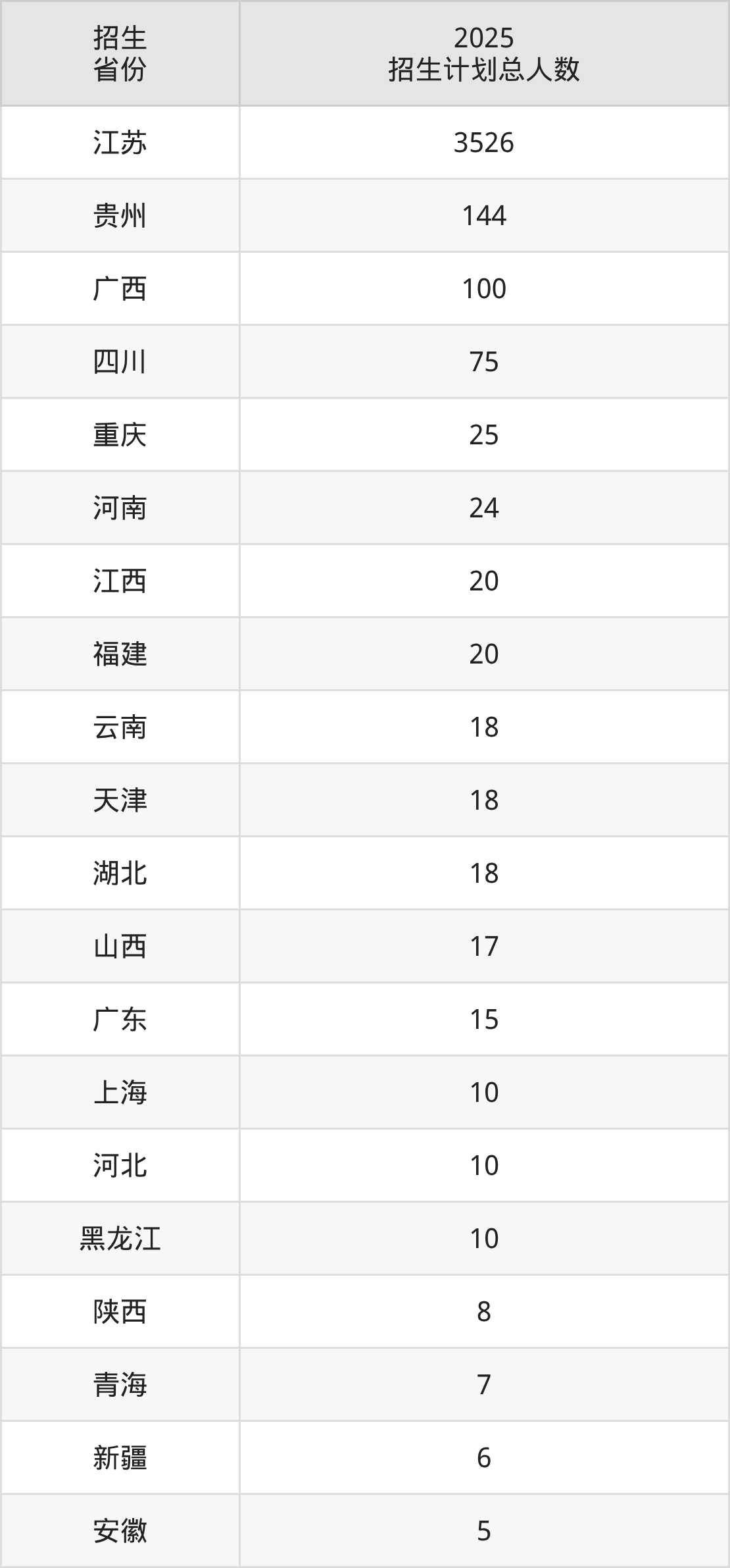 2025年常州工学院面向全国25个省市开展本科招生;招生专业共43个,招生人数共4098人。2025年在江苏省招生计划总人数是3526人,其中,常州工学院在江苏省招生人数最多的是电气工程及其自动化。常州工学院在各省具体招生人数情况如下表。