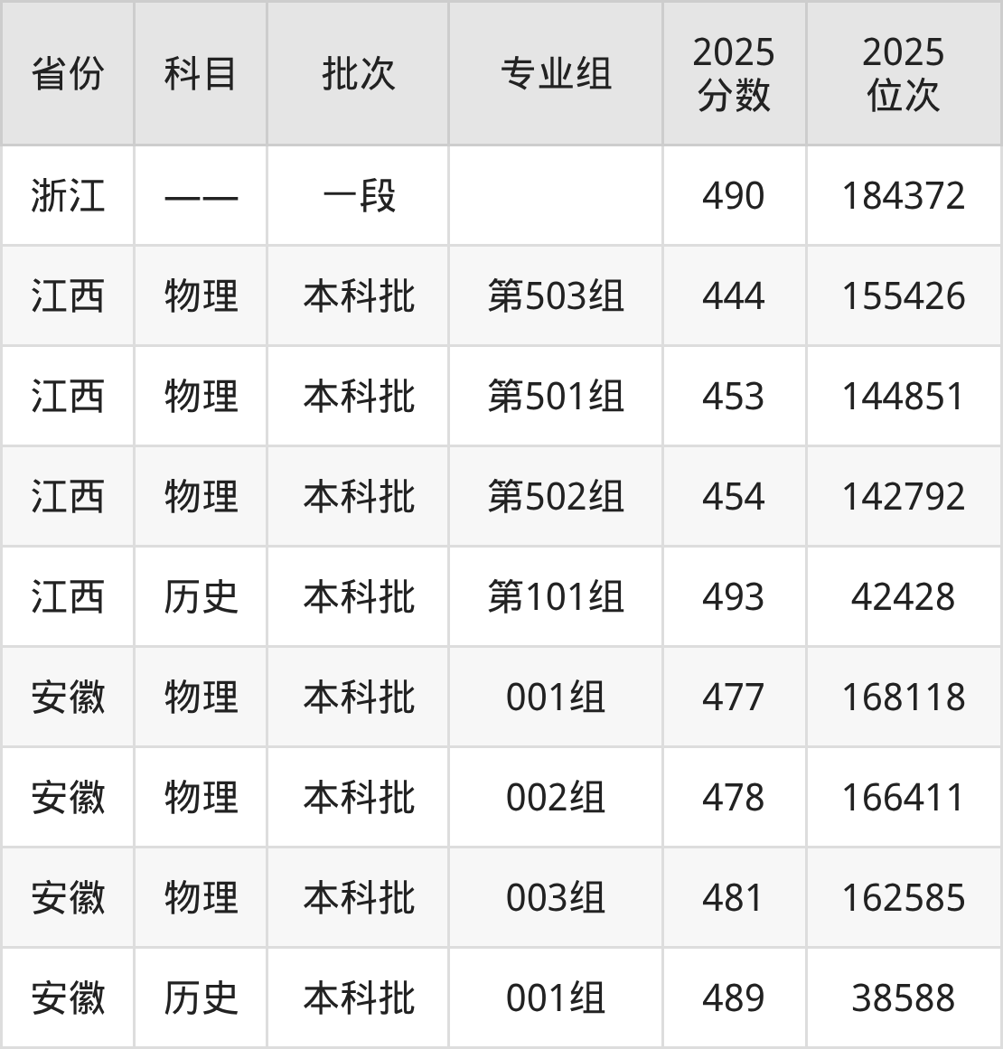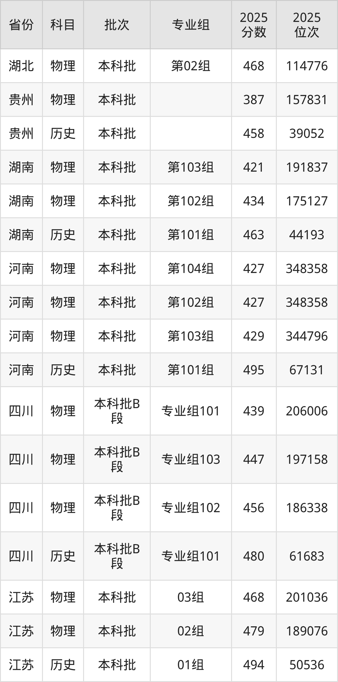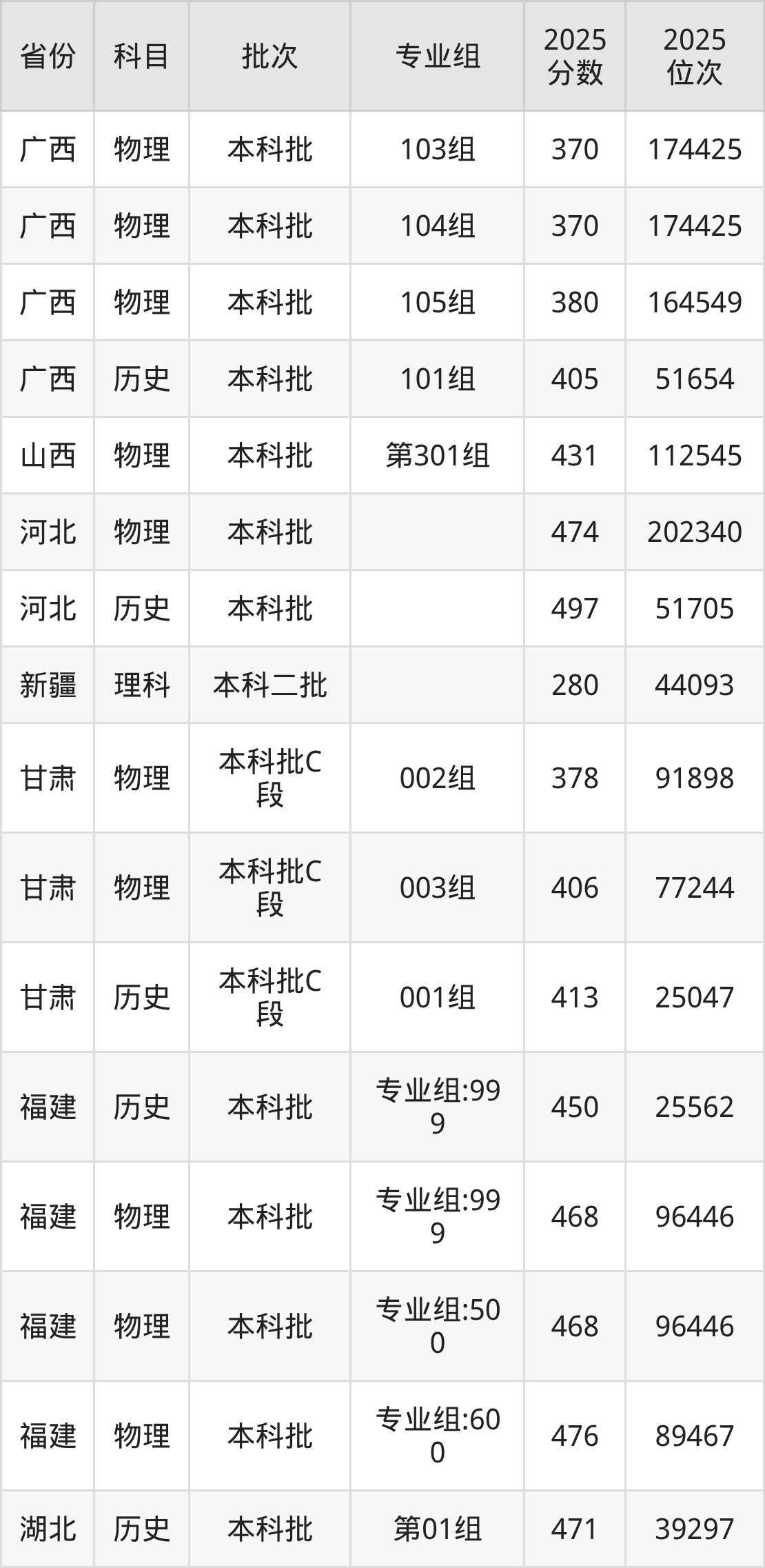 2025年在本科物理类进行招生,各专业组分数线详情如下: