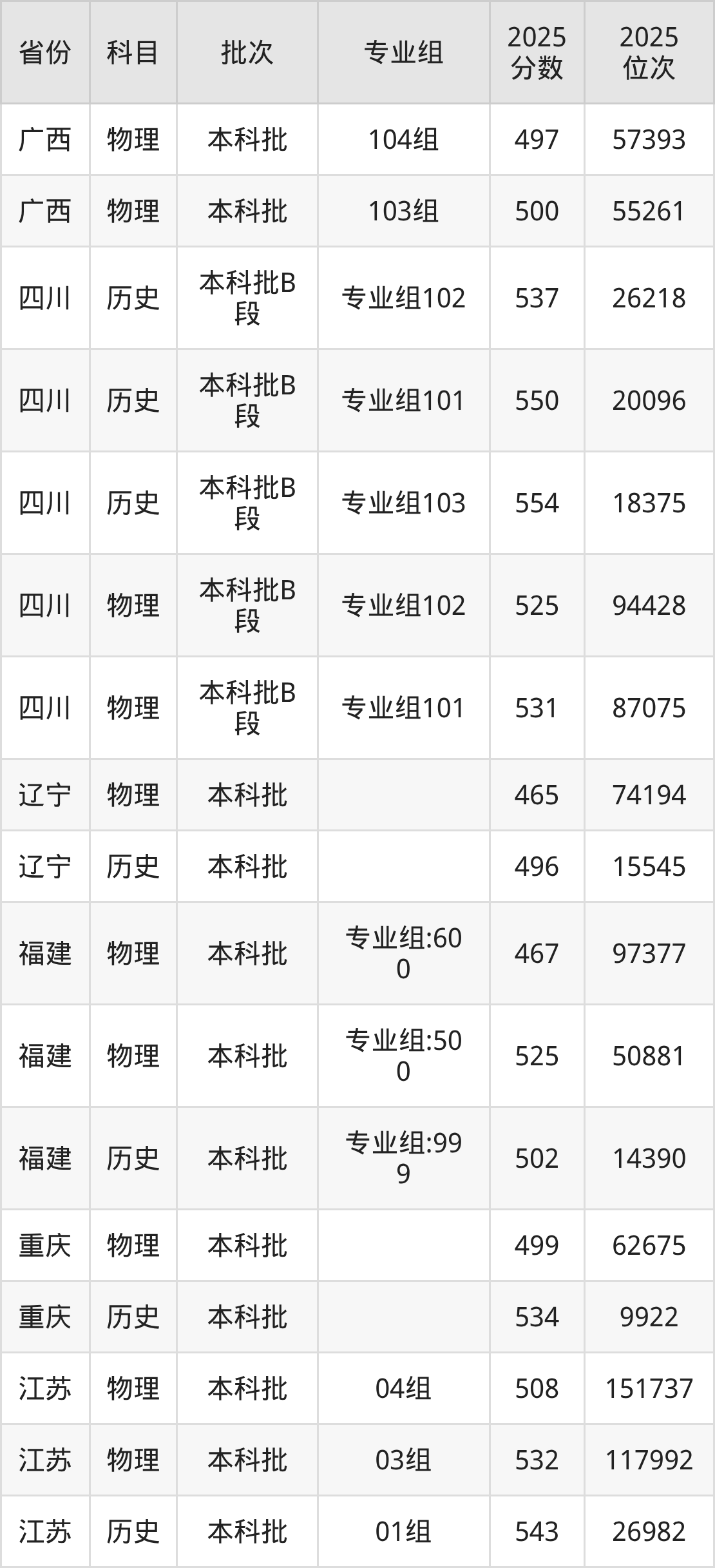 普通类本科物理类最低496分,本科历史类最低543分