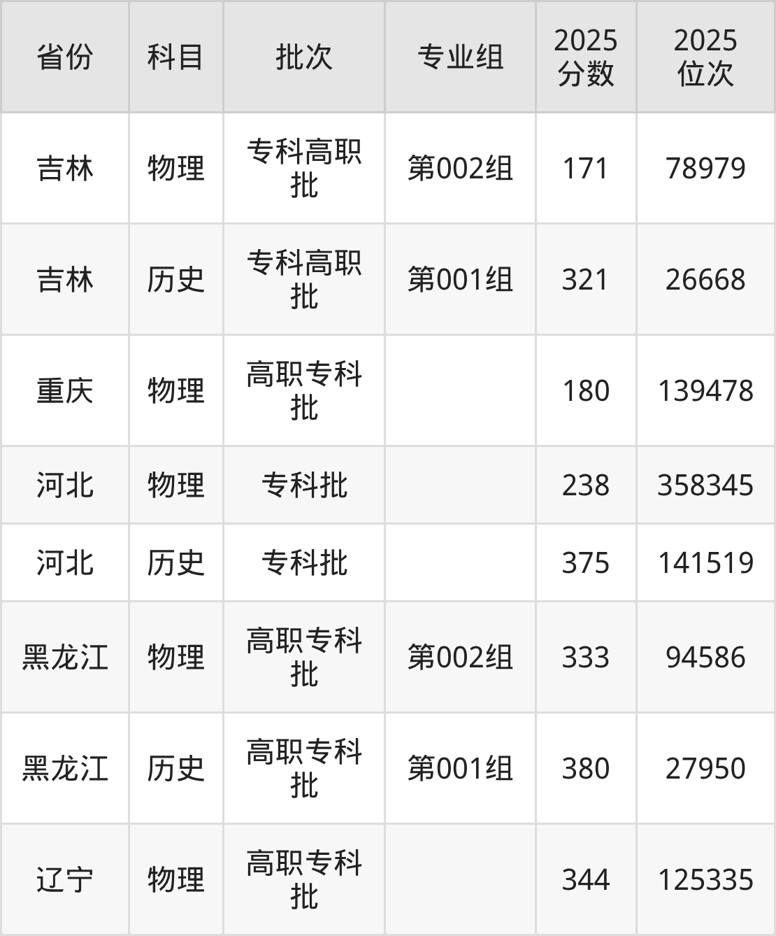 普通类专科物理类最低171分,专科历史类最低321分