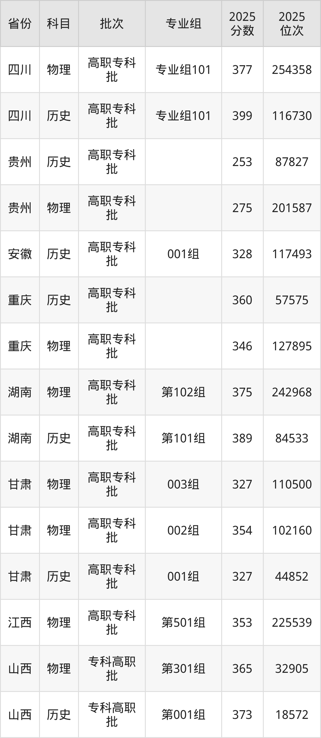 普通类专科物理类最低377分,专科历史类最低399分