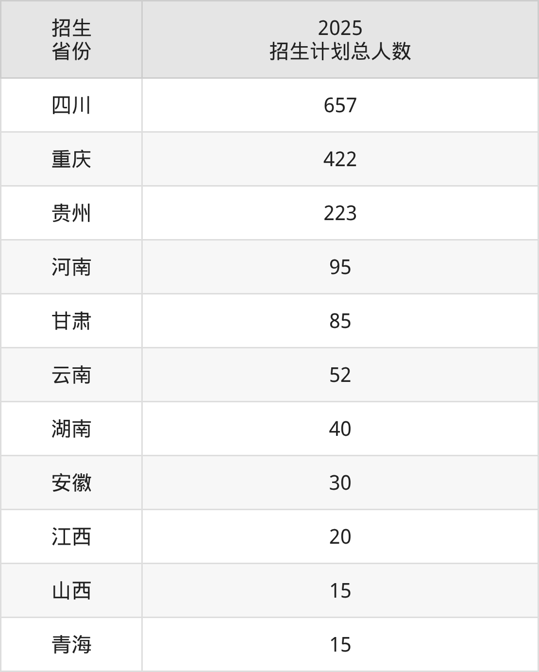 2025年重庆旅游职业学院面向全国11个省市开展专科招生;招生专业共30个,招生人数共1654人。2025年在重庆市招生计划总人数是422人,其中,重庆旅游职业学院在重庆市招生人数最多的是商务英语。重庆旅游职业学院在各省具体招生人数情况如下表。