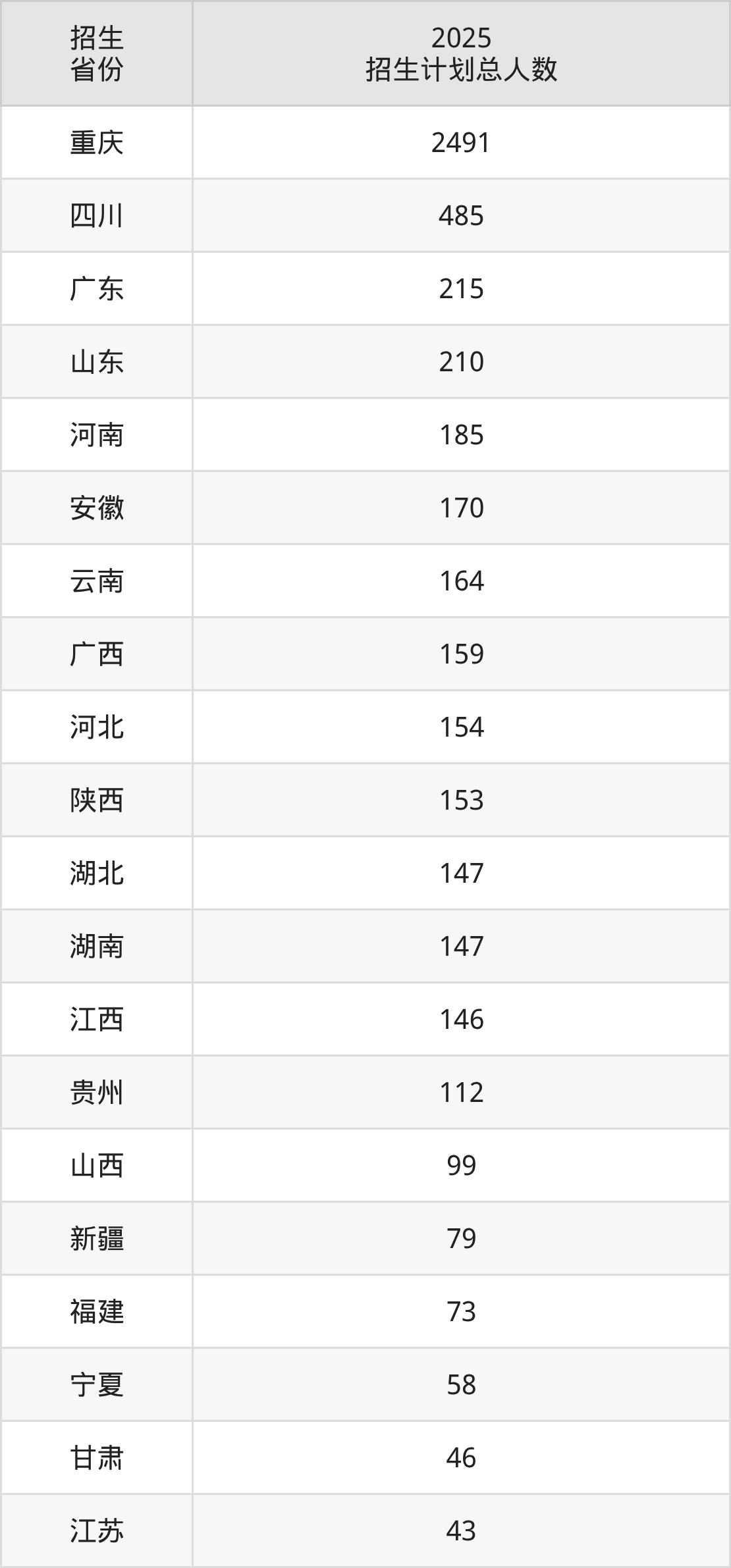 2025年重庆邮电大学面向全国29个省市开展本科招生;招生专业共26个,招生人数共5513人。2025年在重庆市招生计划总人数是2491人,其中,重庆邮电大学在重庆市招生人数最多的是电子信息类。重庆邮电大学在各省具体招生人数情况如下表。