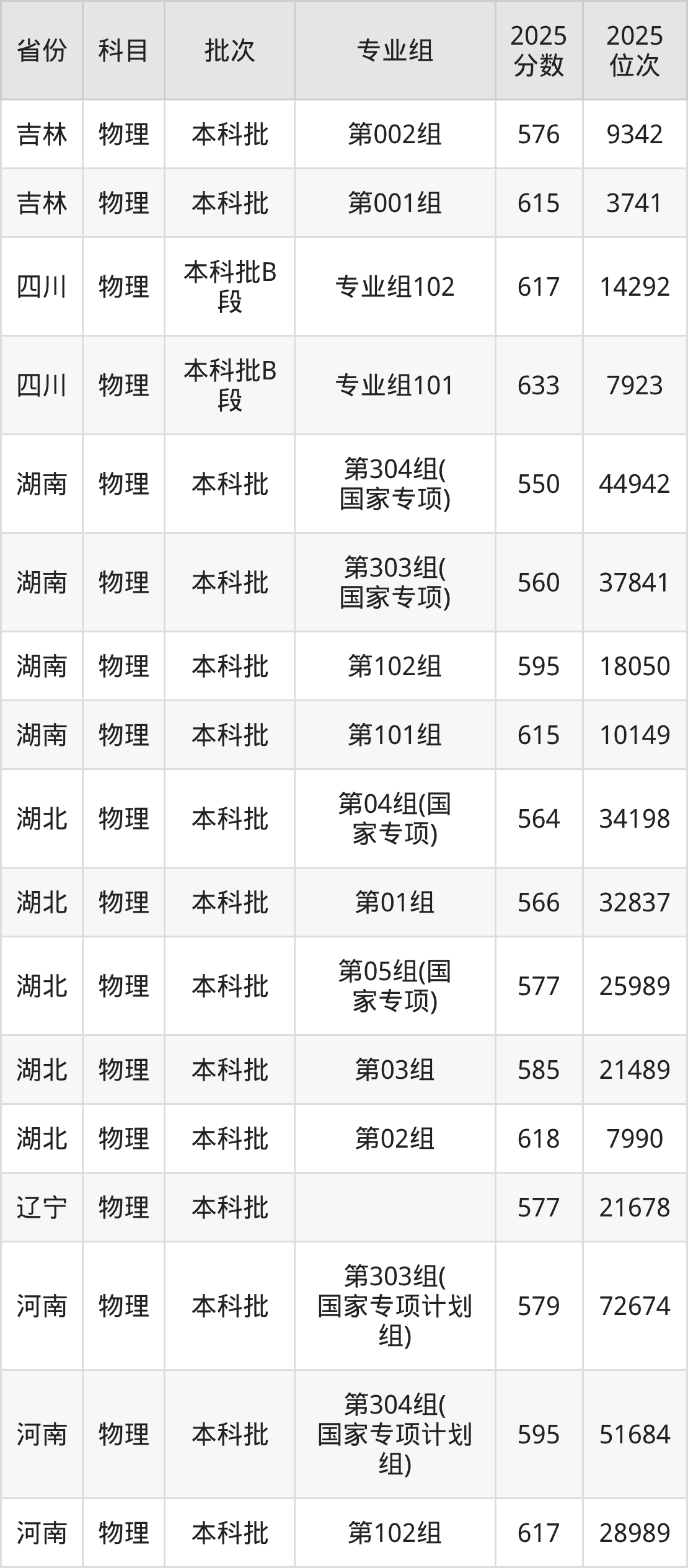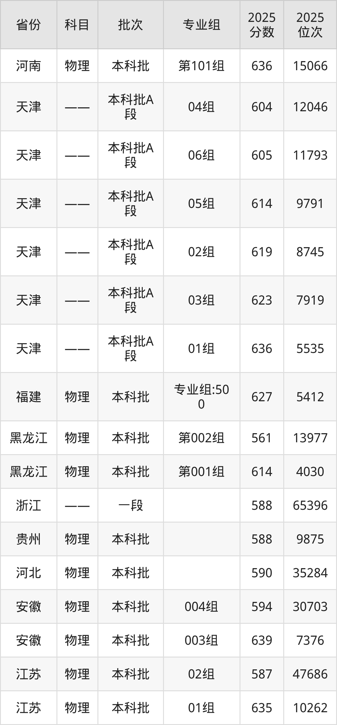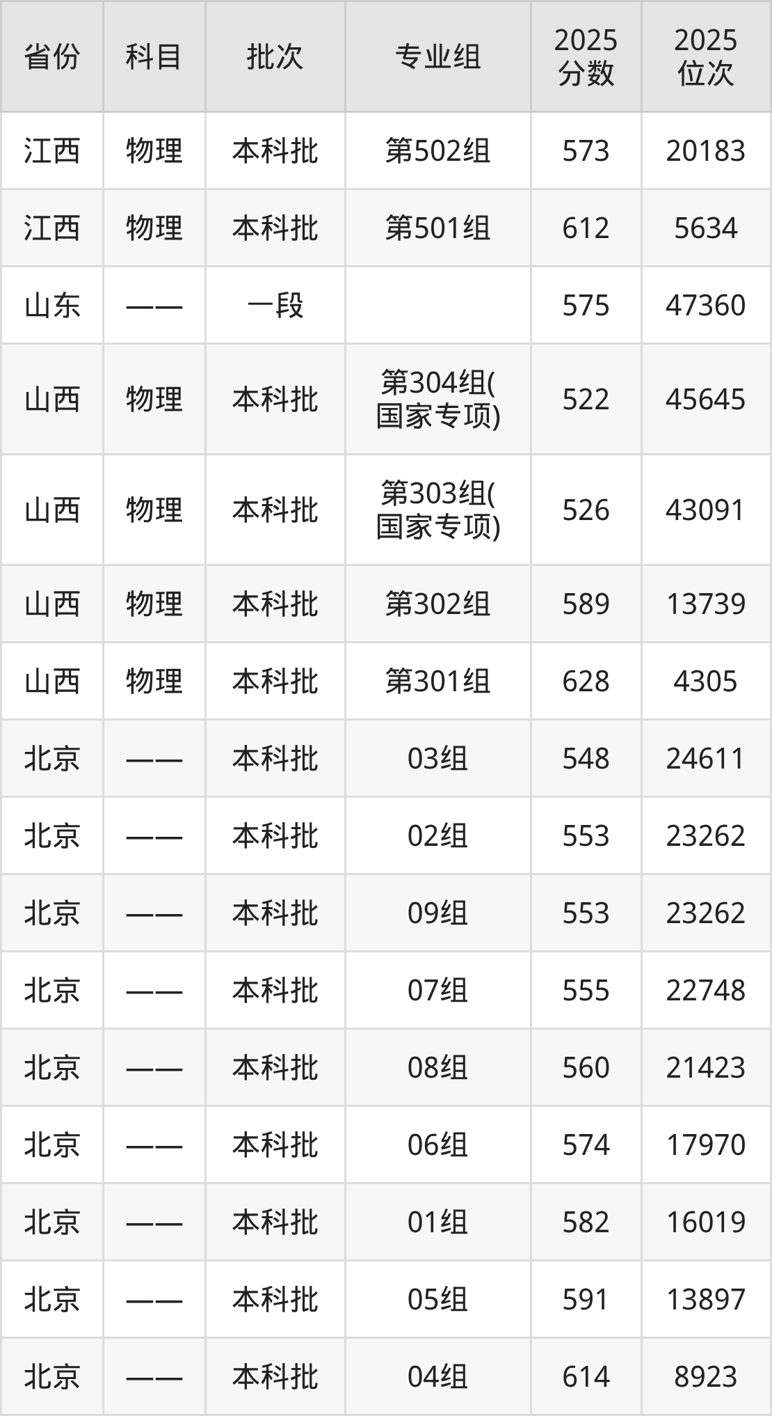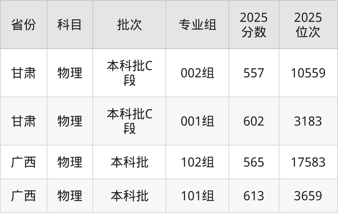 2025年在本科物理类进行招生,各专业组分数线详情如下: