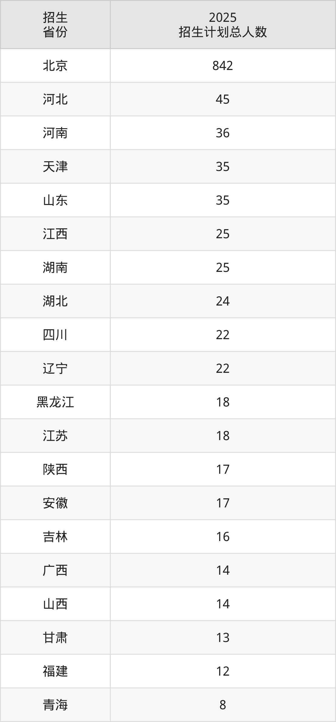2025年首都医科大学面向全国21个省市开展本科招生;招生专业共25个,招生人数共1263人。2025年在北京市招生计划总人数是842人,其中,首都医科大学在北京市招生人数最多的是临床医学。首都医科大学在各省具体招生人数情况如下表。