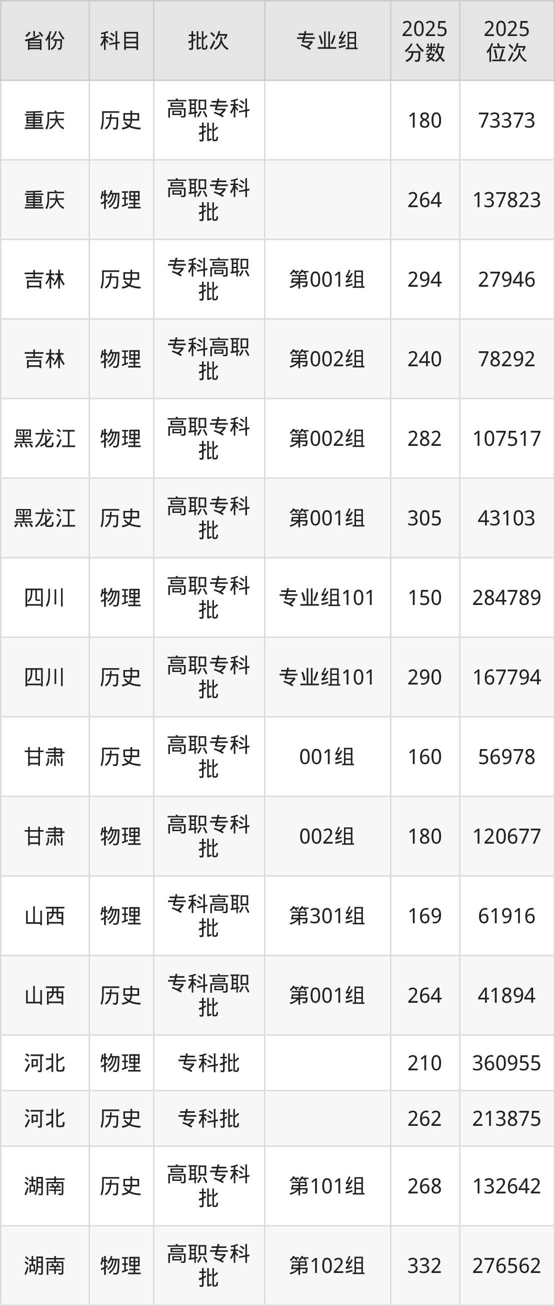 普通类专科物理类最低282分,专科历史类最低305分