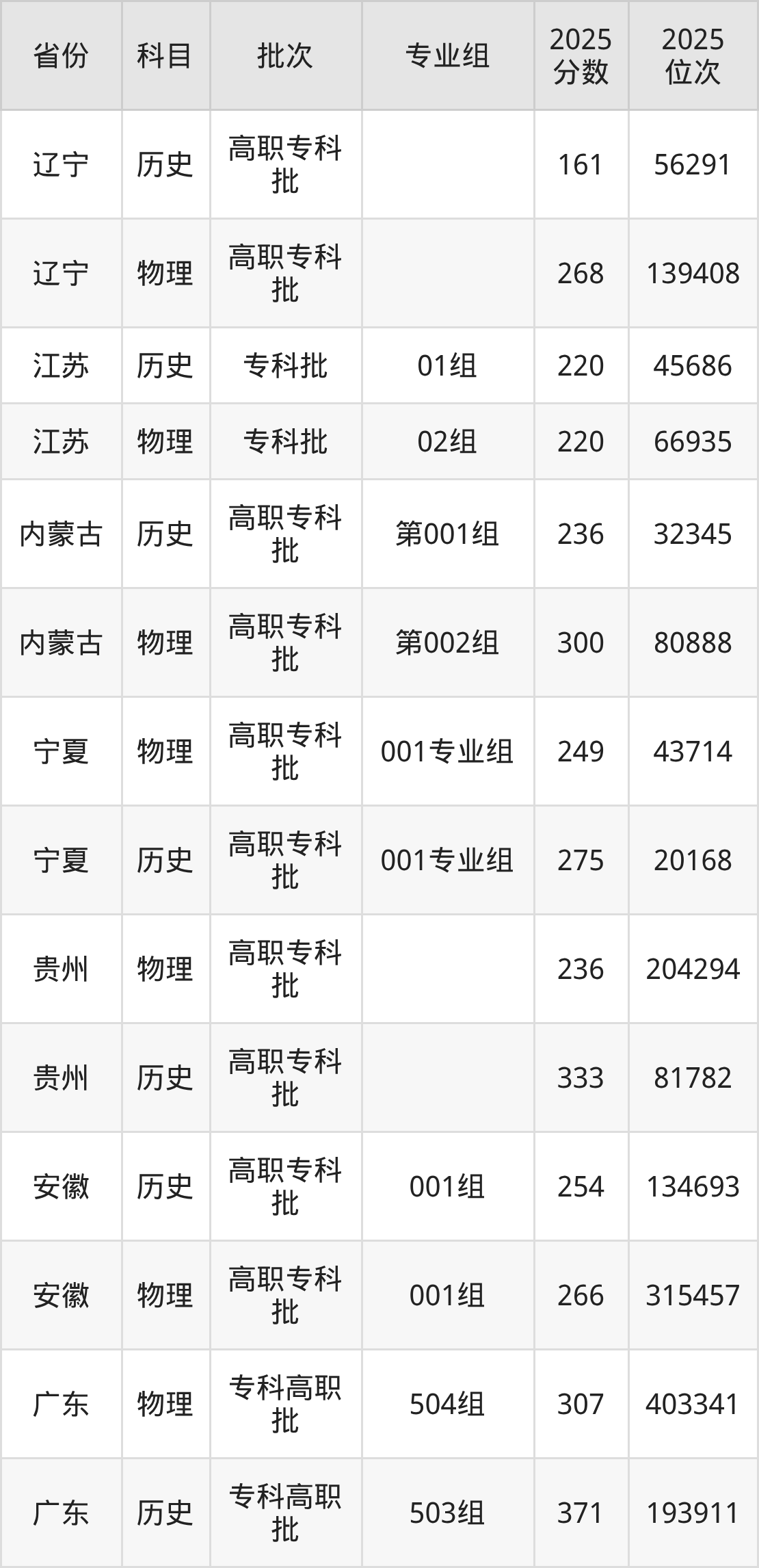 普通类专科物理类最低236分,专科历史类最低333分