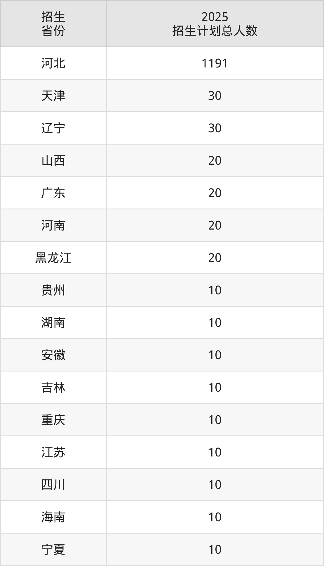 2025年石家庄科技信息职业学院面向全国22个省市开展专科招生;招生专业共56个,招生人数共1461人。2025年在河北省招生计划总人数是1191人,其中,石家庄科技信息职业学院在河北省招生人数最多的是信息安全技术应用。石家庄科技信息职业学院在各省具体招生人数情况如下表。