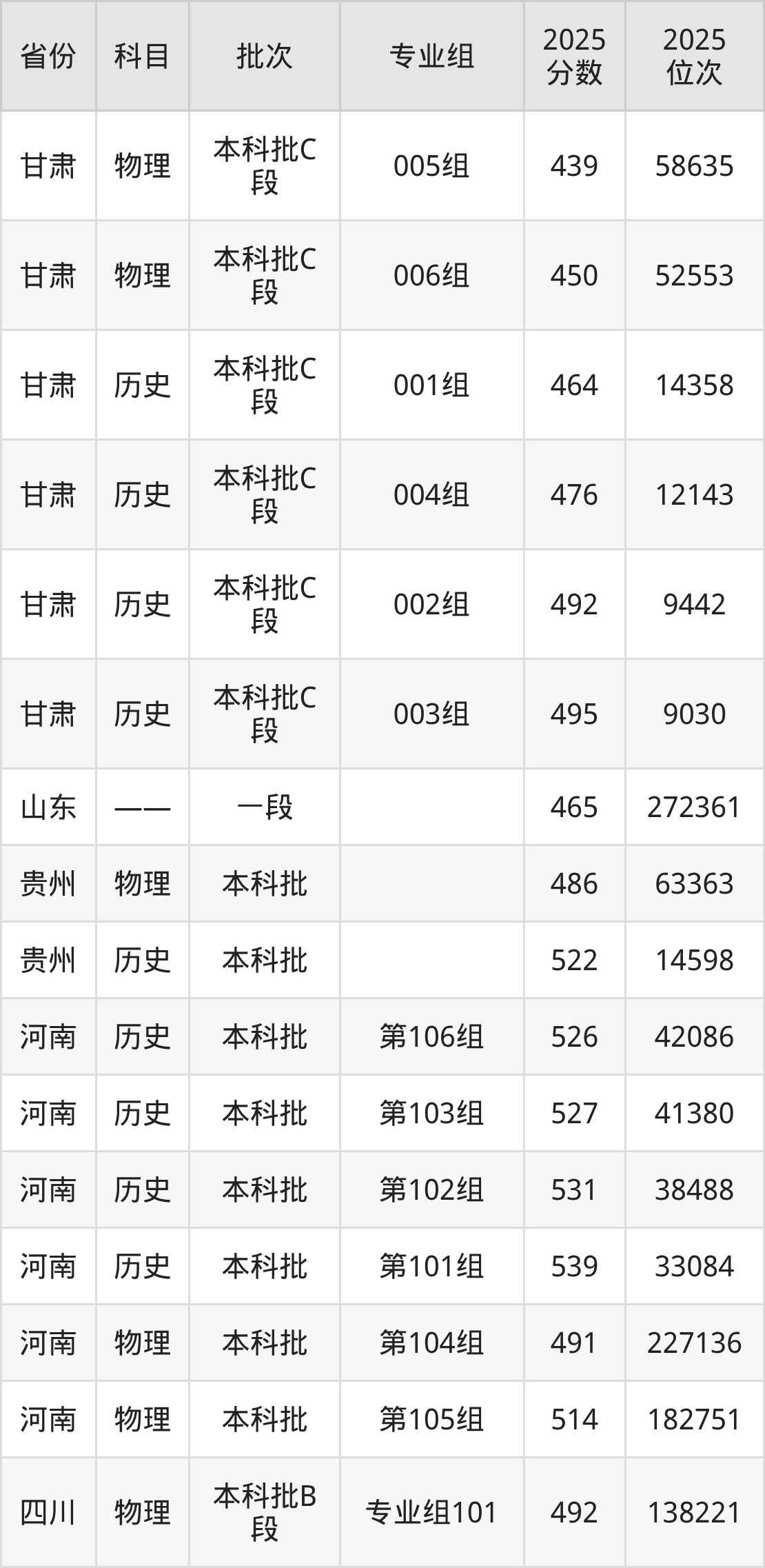 普通类本科物理类最低439分,本科历史类最低464分