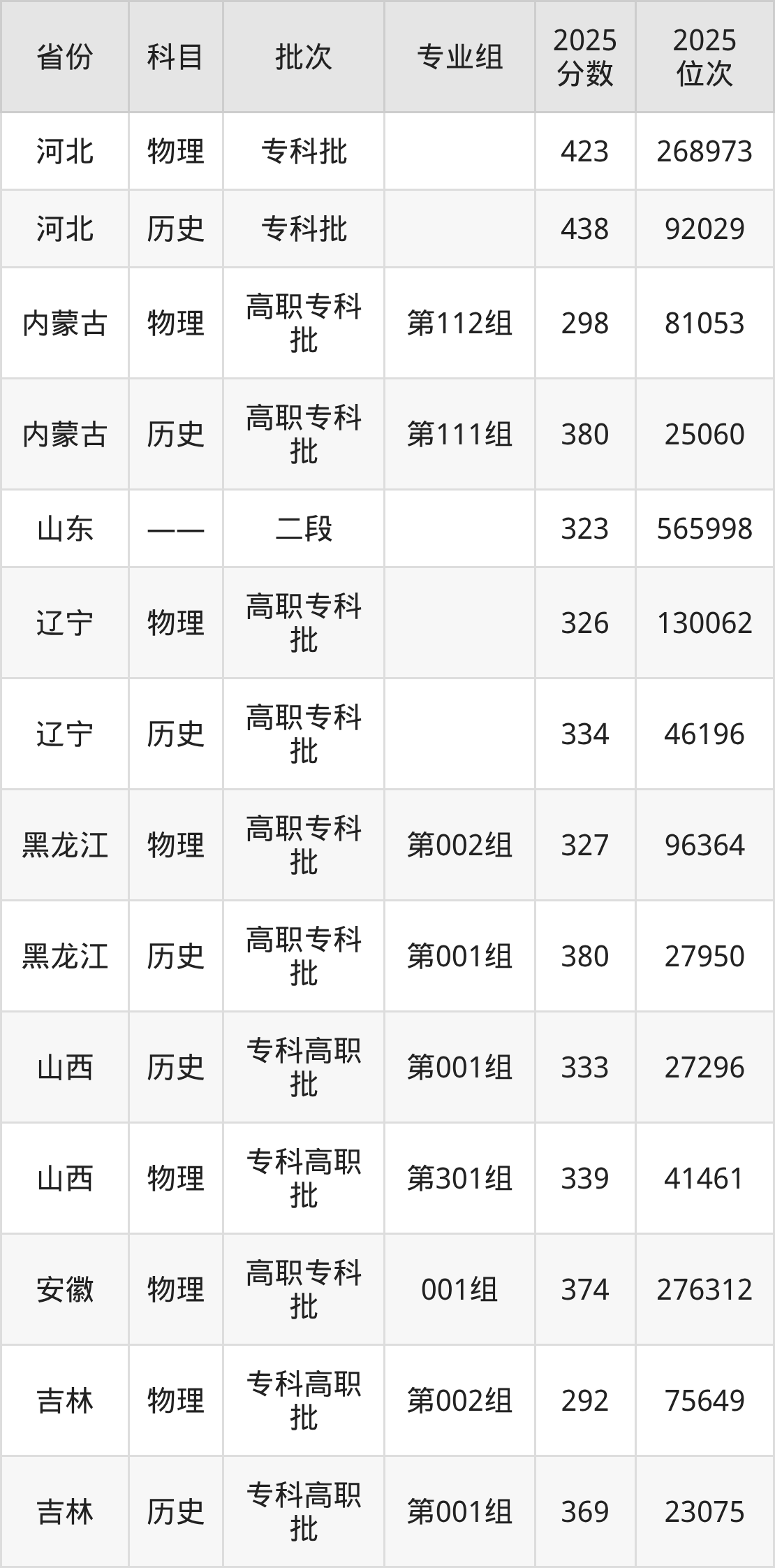 2025年在专科物理类进行招生,各专业组分数线详情如下: