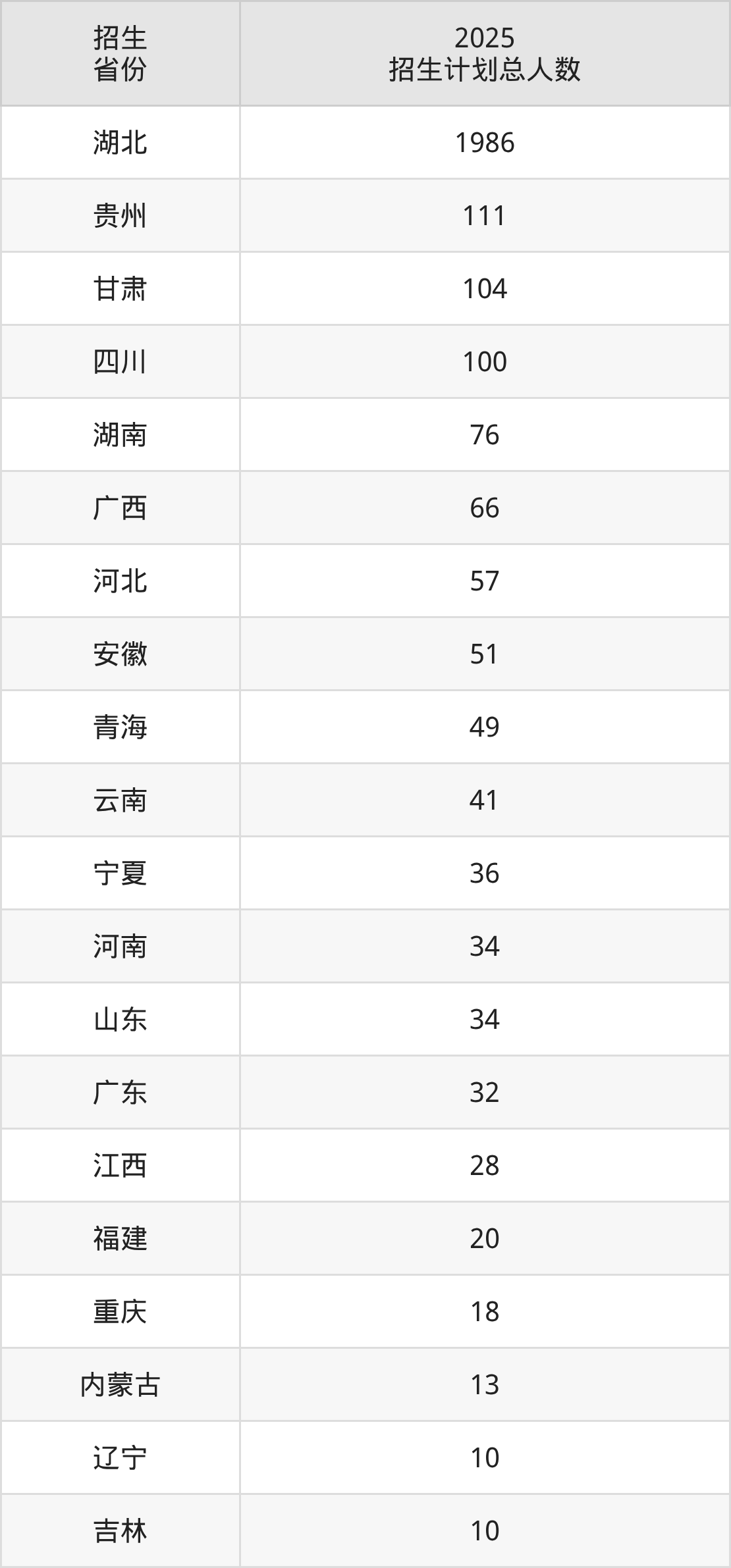 2025年咸宁职业技术学院面向全国27个省市开展专科招生;招生专业共40个,招生人数共2938人。2025年在湖北省招生计划总人数是1986人,其中,咸宁职业技术学院在湖北省招生人数最多的是工业机器人技术。咸宁职业技术学院在各省具体招生人数情况如下表。