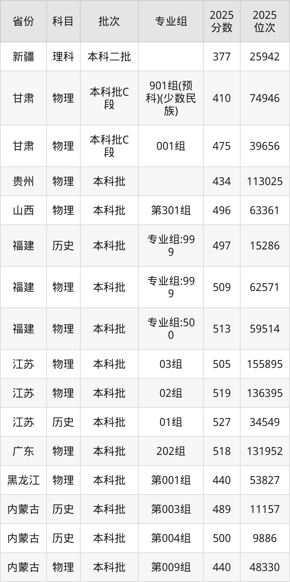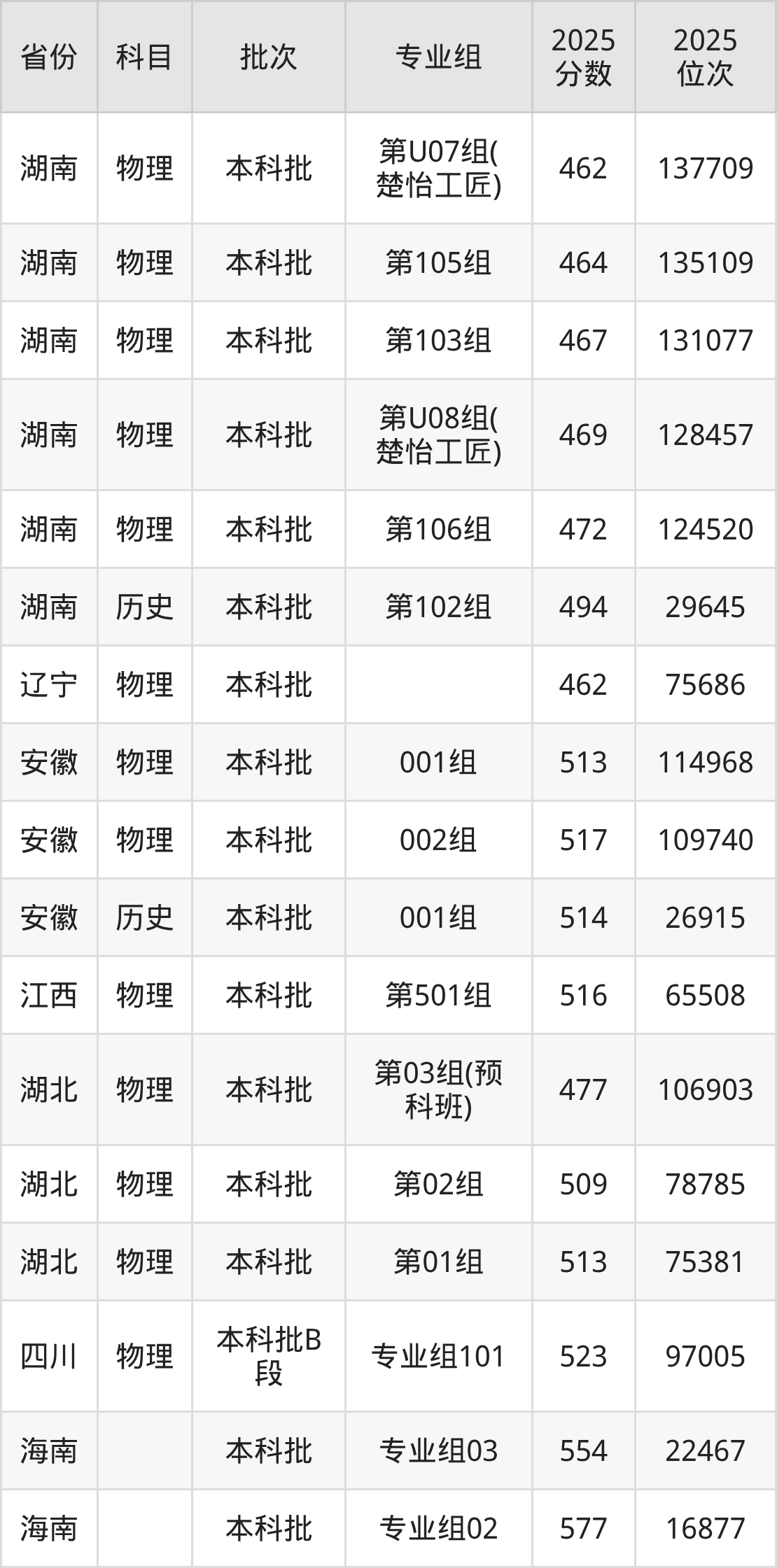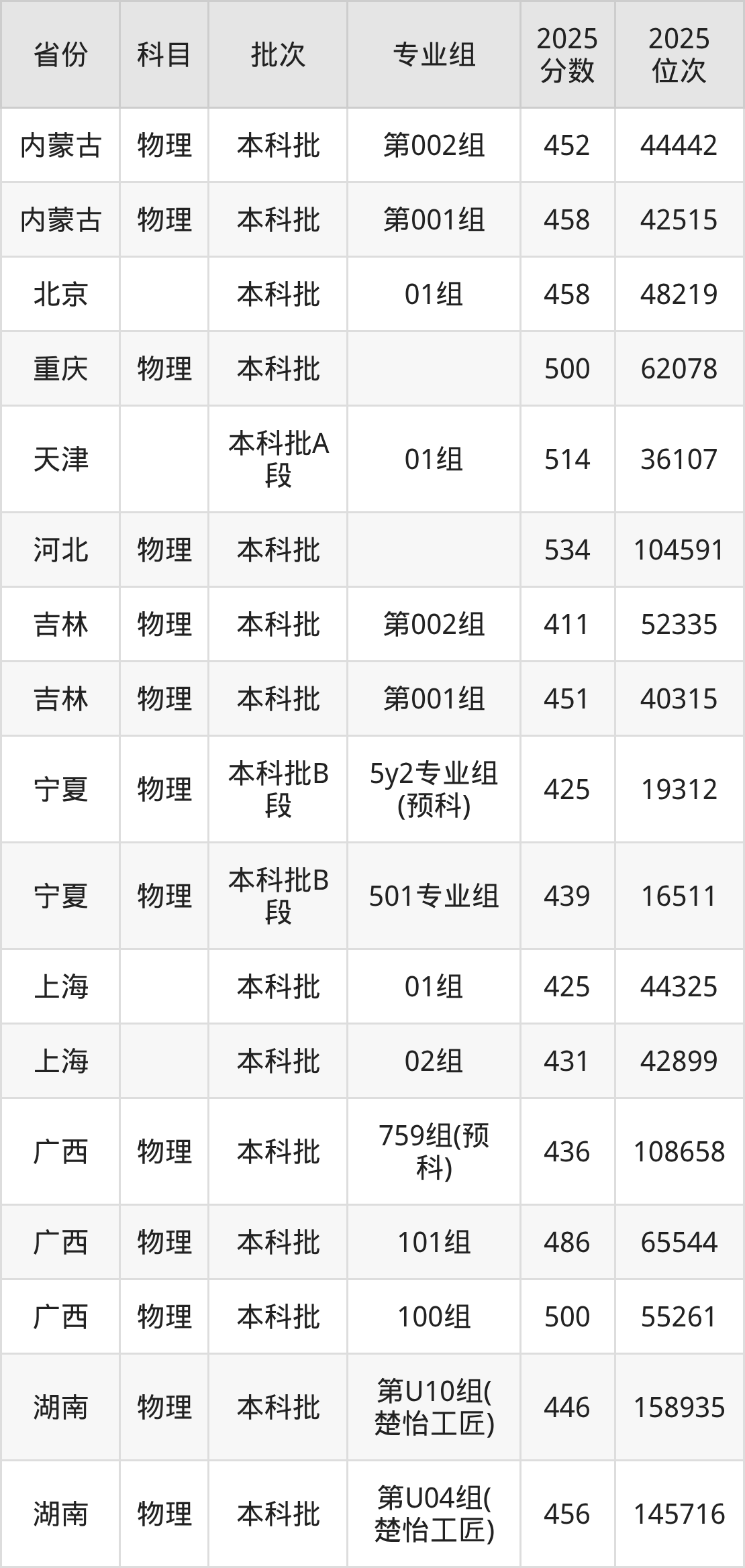 2025年在本科物理类进行招生,各专业组分数线详情如下: