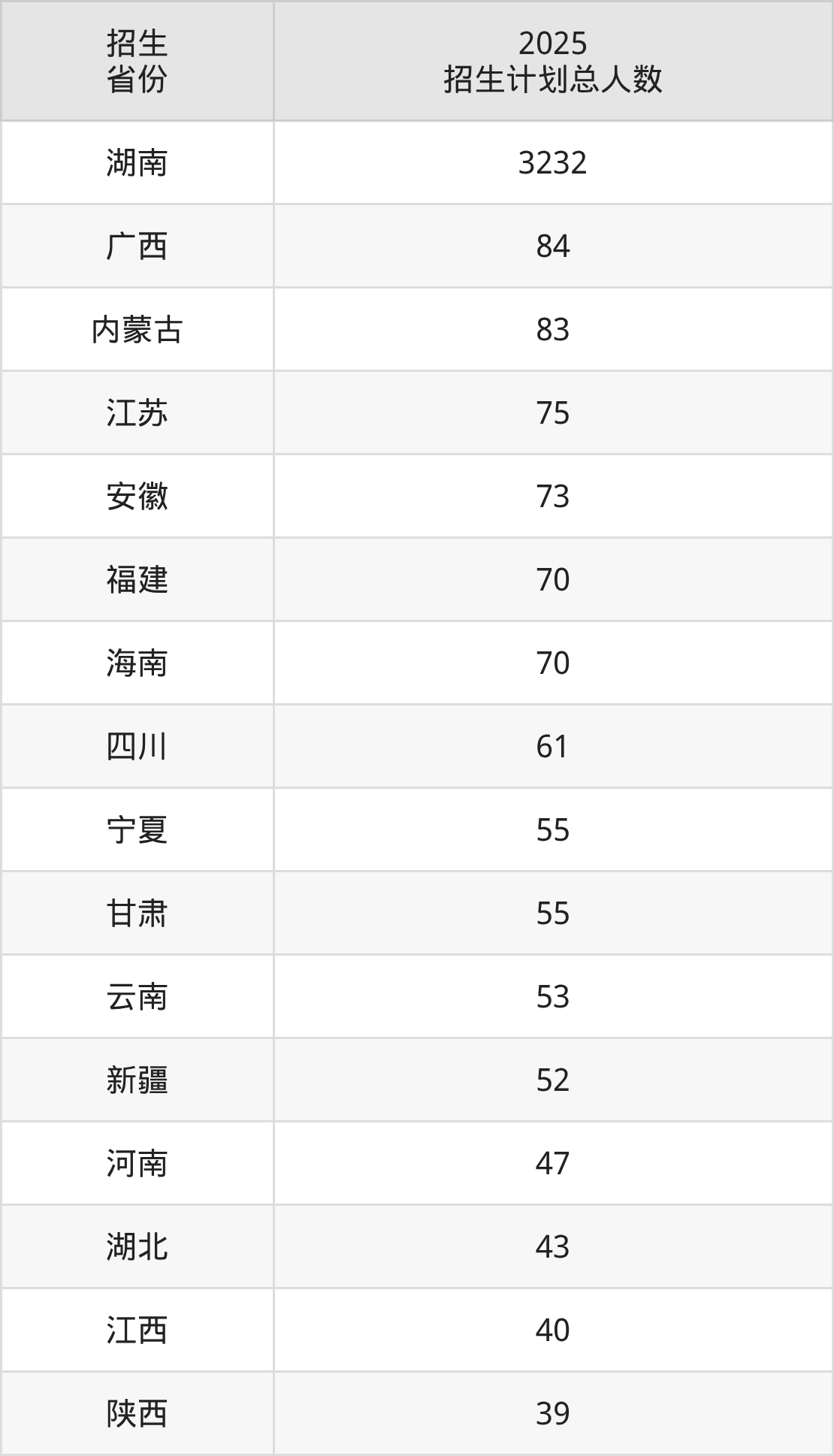 2025年湖南工学院面向全国28个省市开展本科招生;招生专业共44个,招生人数共4397人。2025年在湖南省招生计划总人数是3232人,其中,湖南工学院在湖南省招生人数最多的是电气工程及其自动化。湖南工学院在各省具体招生人数情况如下表。