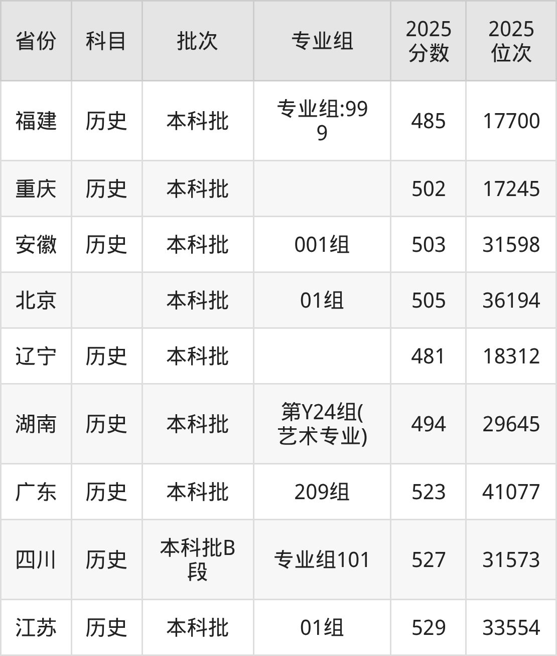2025年在本科历史类进行招生,各专业组分数线详情如下:
