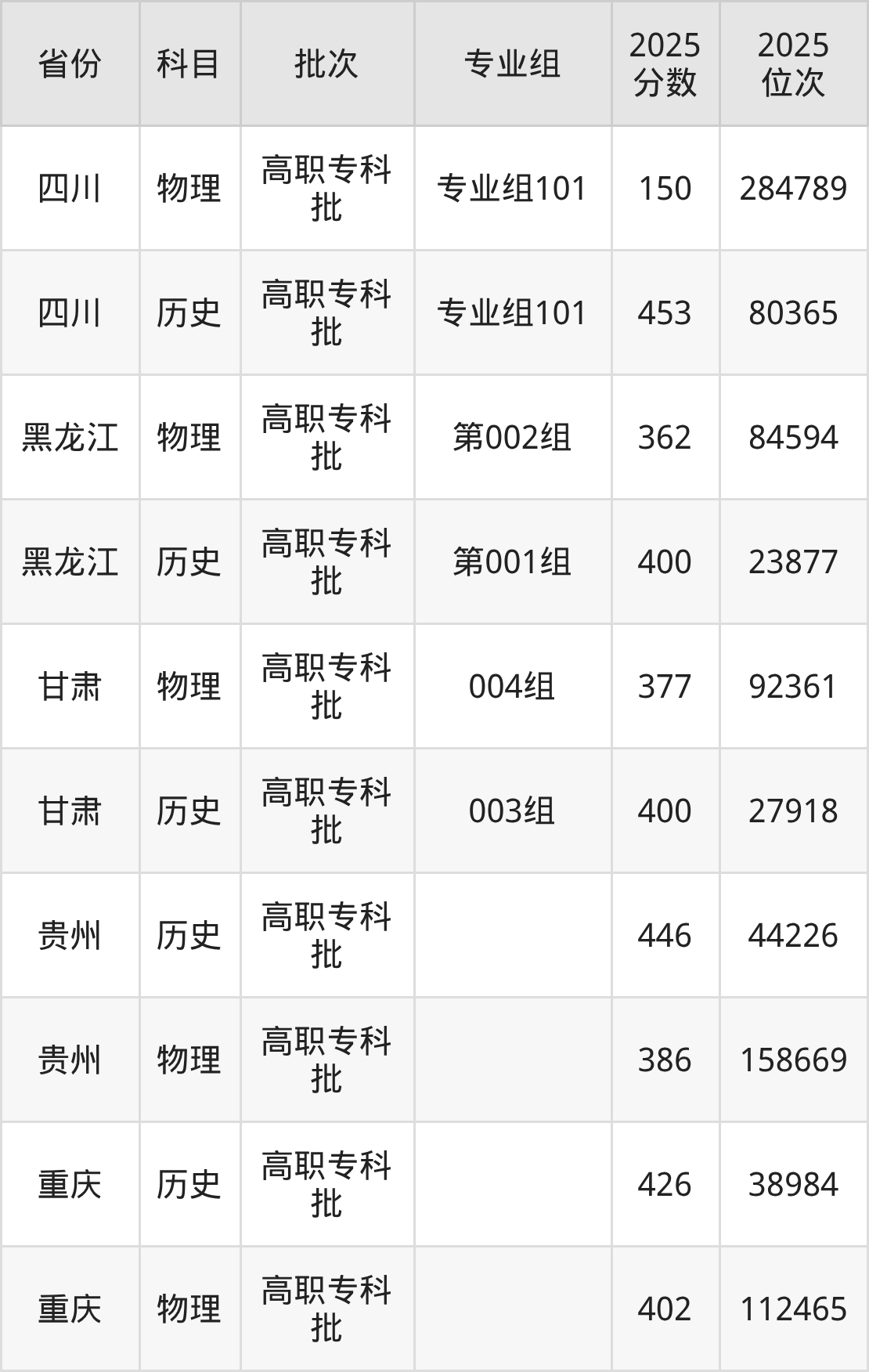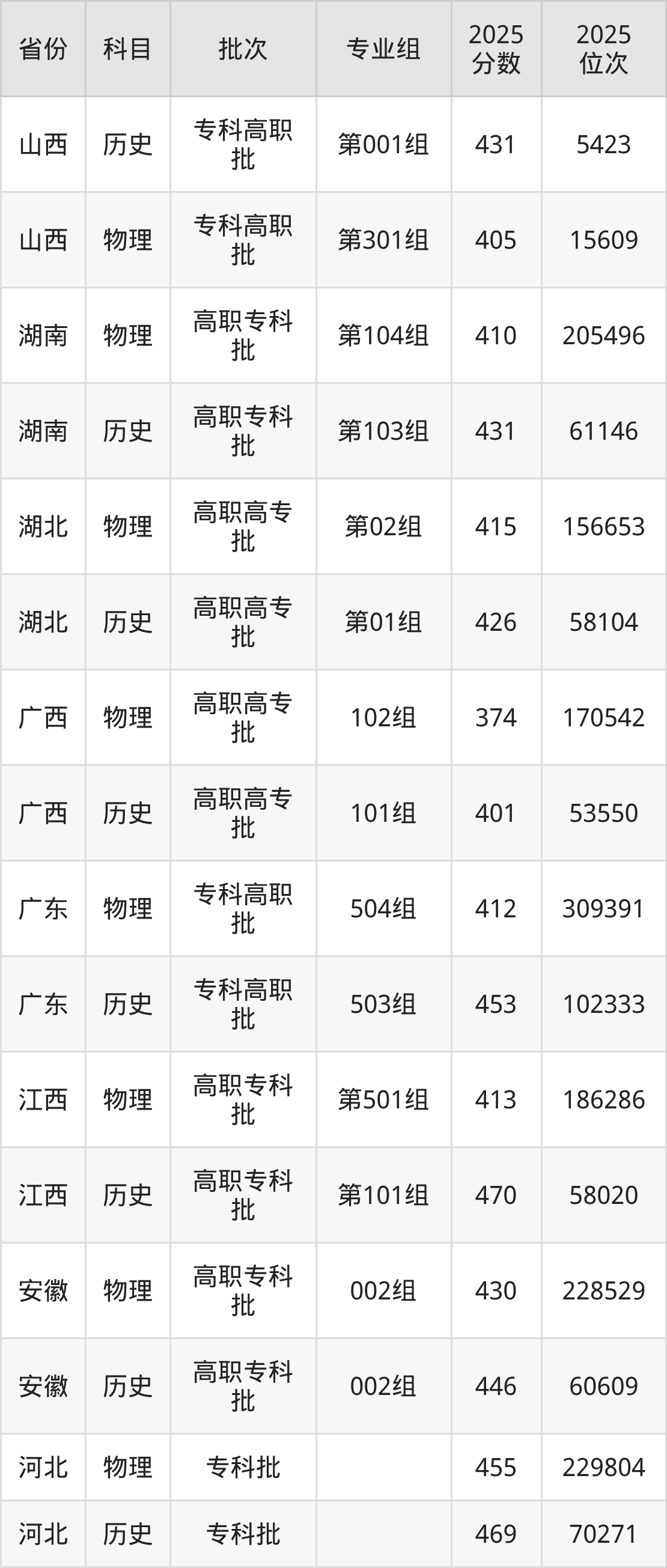 普通类专科物理类最低402分,专科历史类最低426分