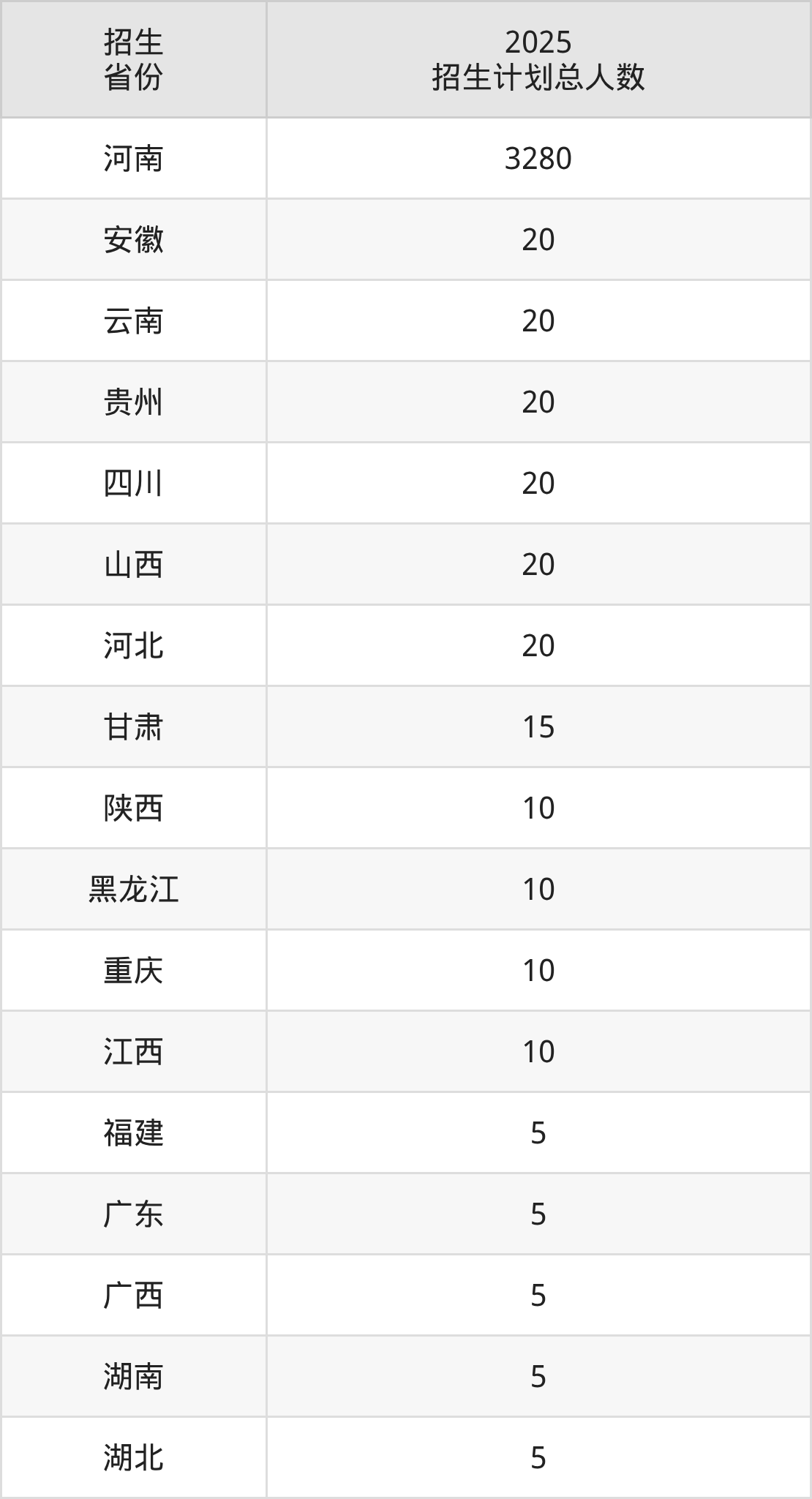 2025年河南医学高等专科学校面向全国17个省市开展专科招生;招生专业共20个,招生人数共3480人。2025年在河南省招生计划总人数是3280人,其中,河南医学高等专科学校在河南省招生人数最多的是护理。河南医学高等专科学校在各省具体招生人数情况如下表。