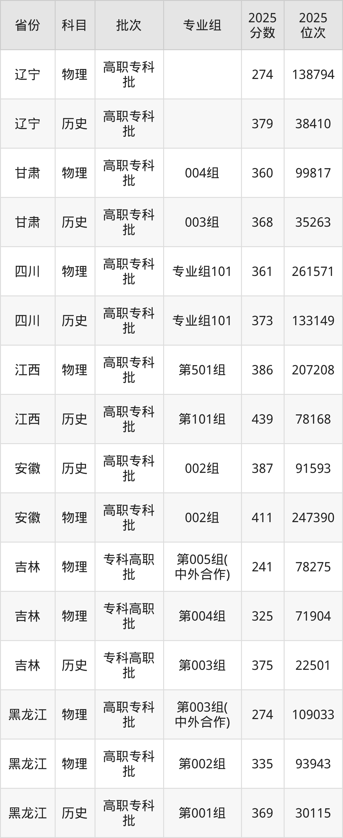 普通类专科物理类最低241分,专科历史类最低375分