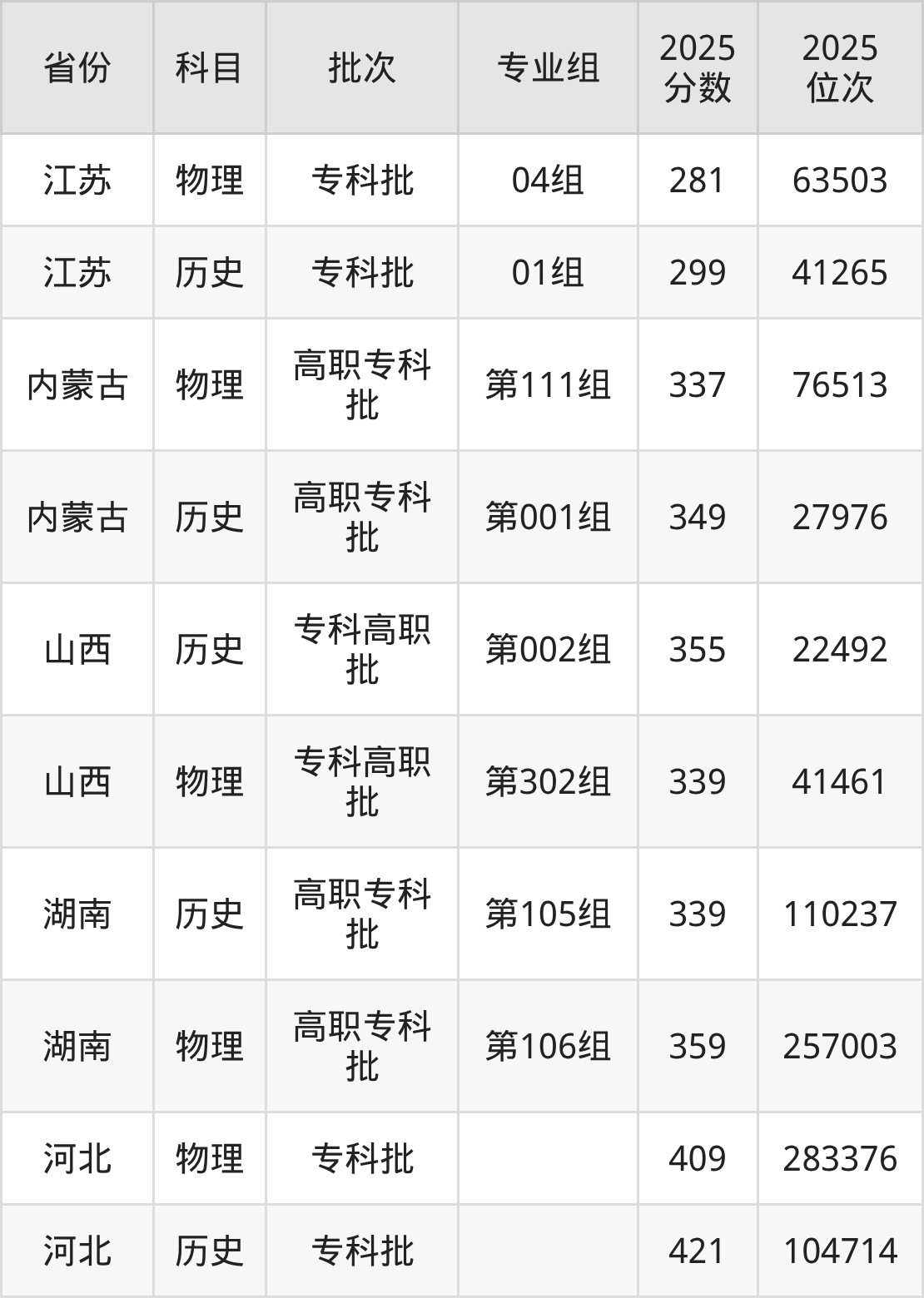 普通类专科物理类最低281分,专科历史类最低299分