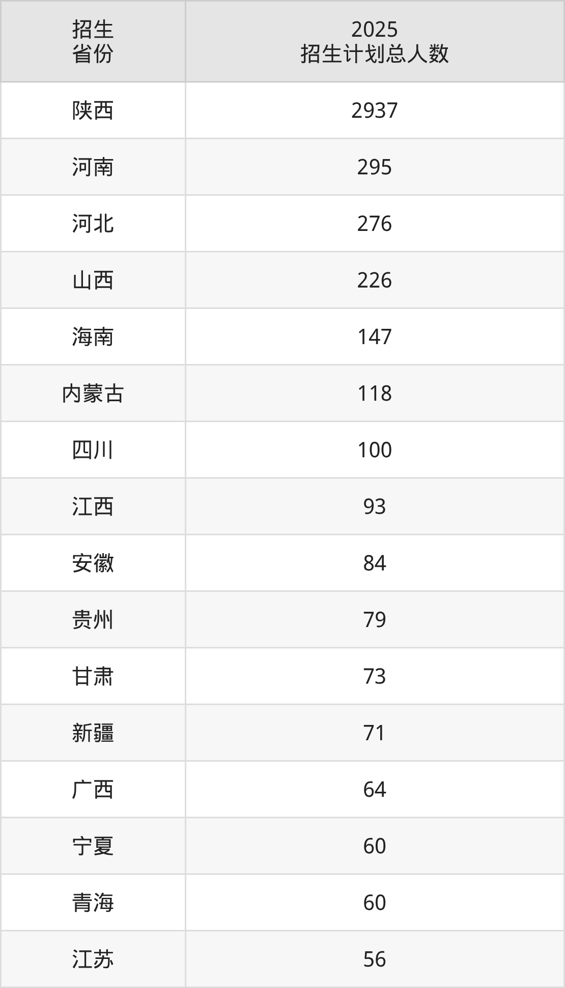 2025年西安外事学院面向全国25个省市开展本科招生;招生专业共31个,招生人数共3359人。2025年在陕西省招生计划总人数是2937人,其中,西安外事学院在陕西省招生人数最多的是汉语言文学。西安外事学院在各省具体招生人数情况如下表。