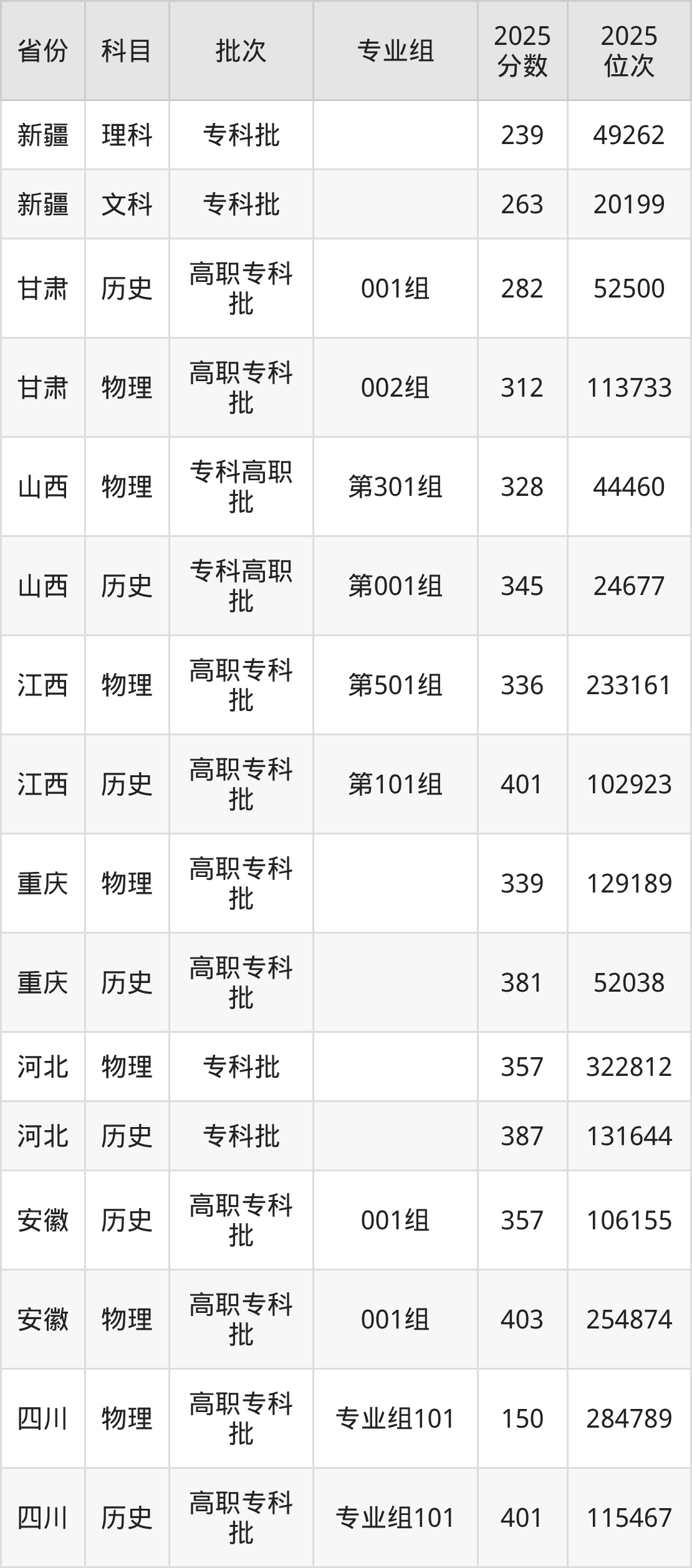 普通类专科物理类最低339分,专科历史类最低381分