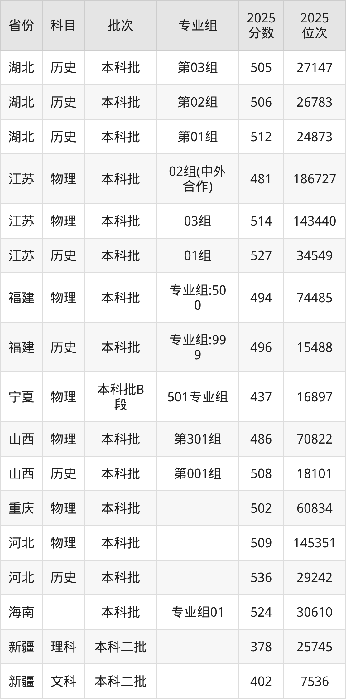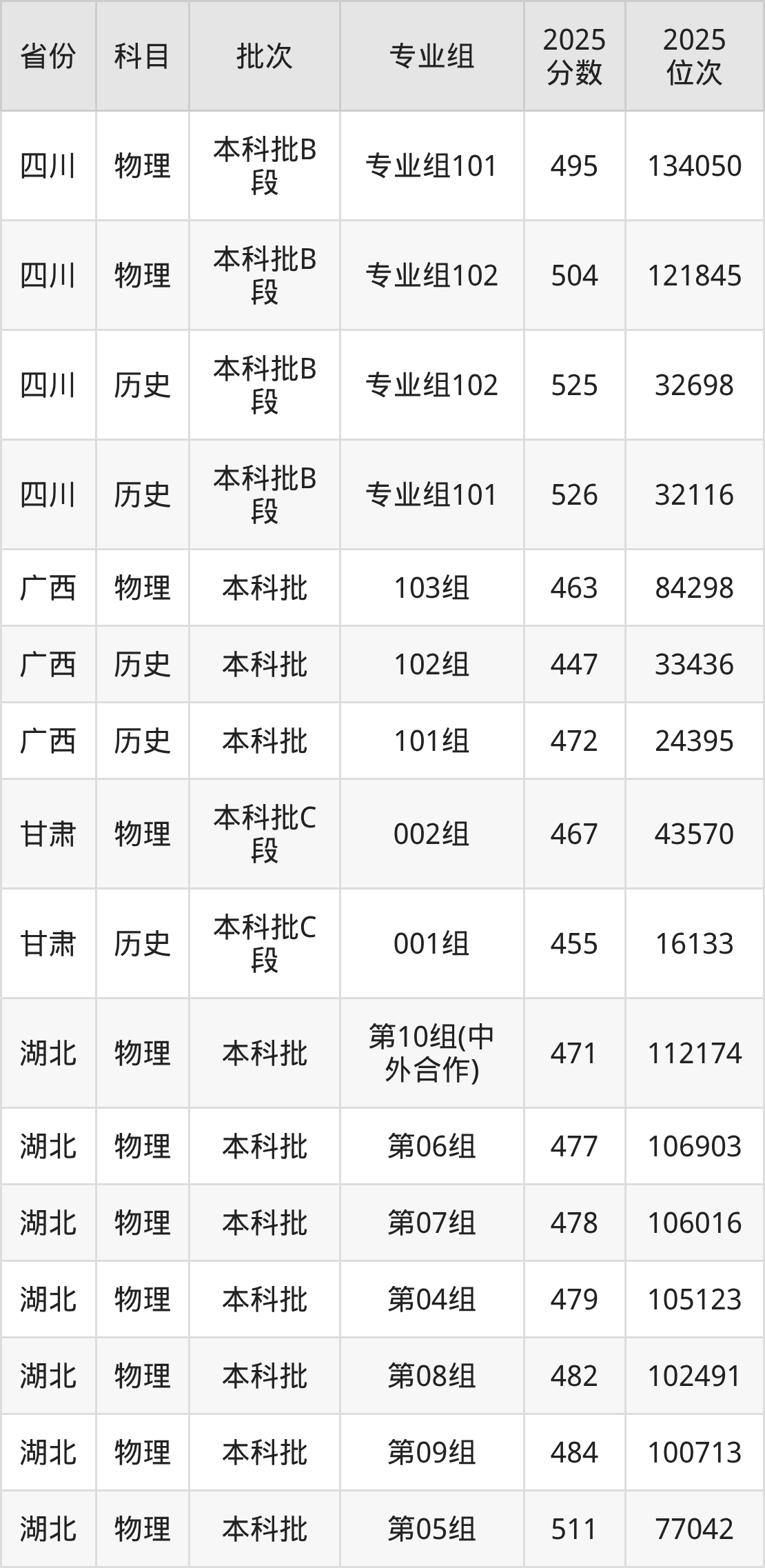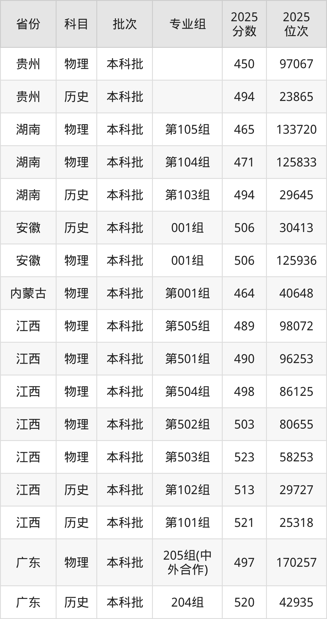 2025年在本科物理类进行招生,各专业组分数线详情如下: