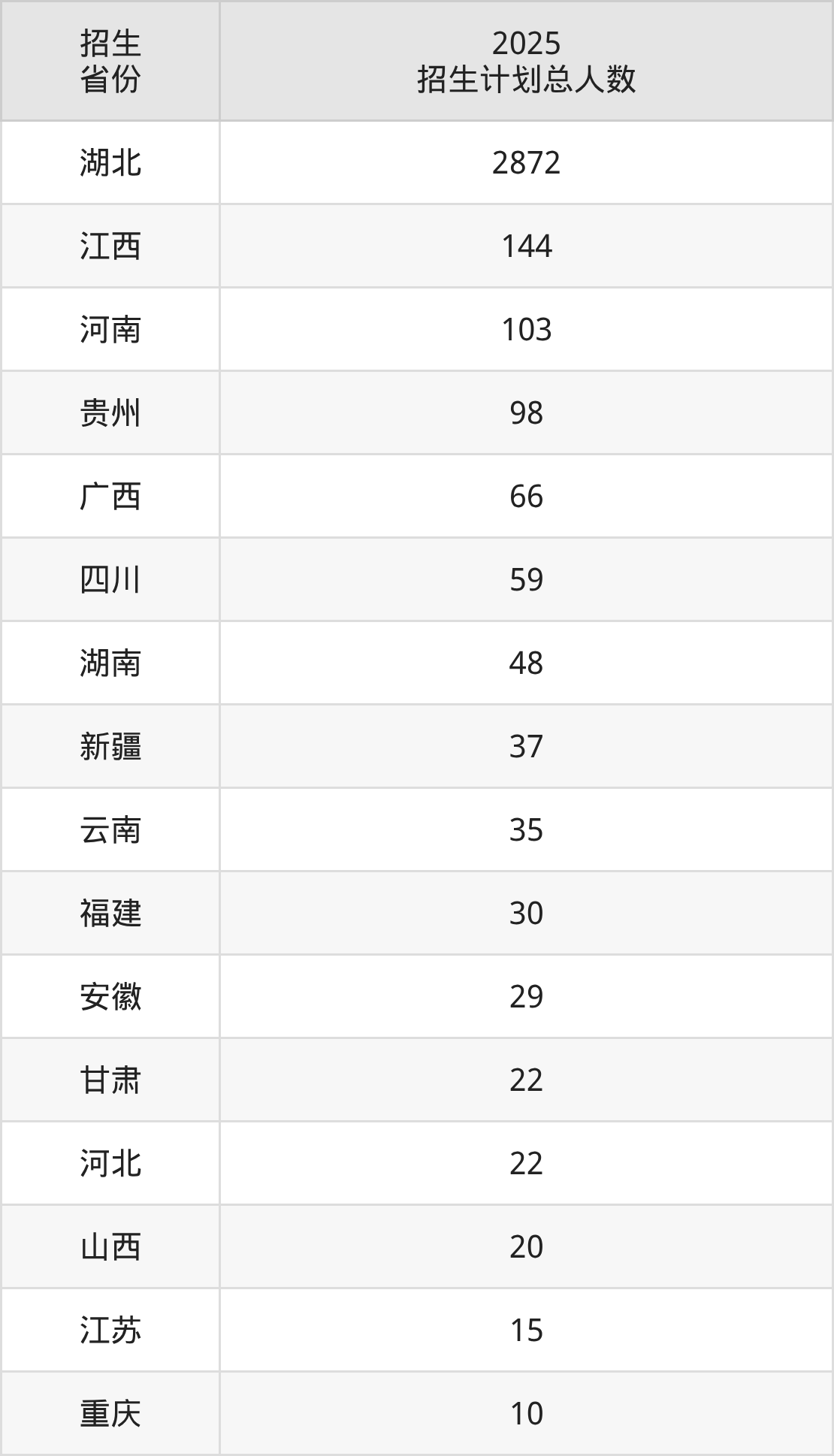 2025年荆楚理工学院面向全国21个省市开展本科招生;招生专业共37个,招生人数共3638人。2025年在湖北省招生计划总人数是2872人,其中,荆楚理工学院在湖北省招生人数最多的是化学工程与工艺。荆楚理工学院在各省具体招生人数情况如下表。