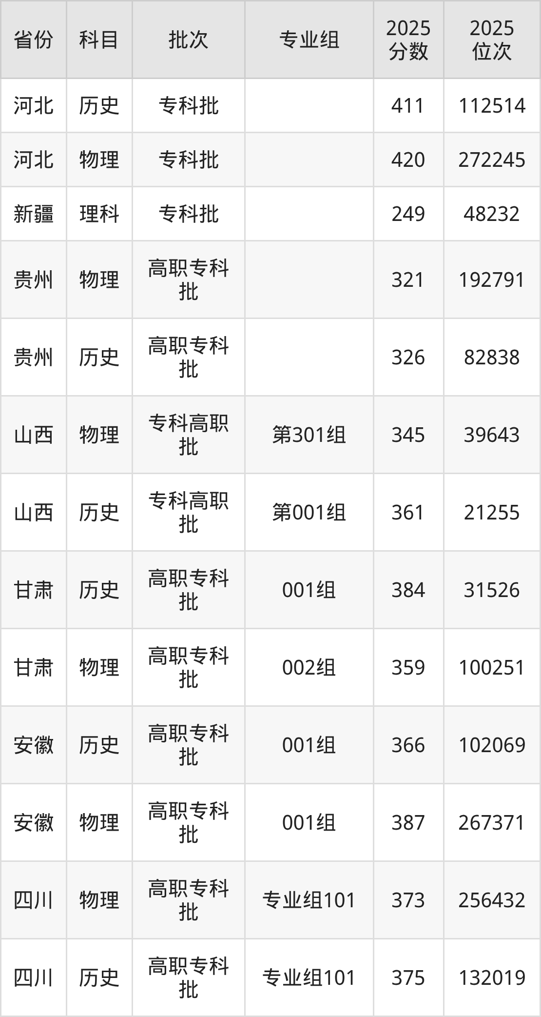 郑州职业技术学院专业组101:2025年投档录取最低分为373分,录取最低位次为256432名。