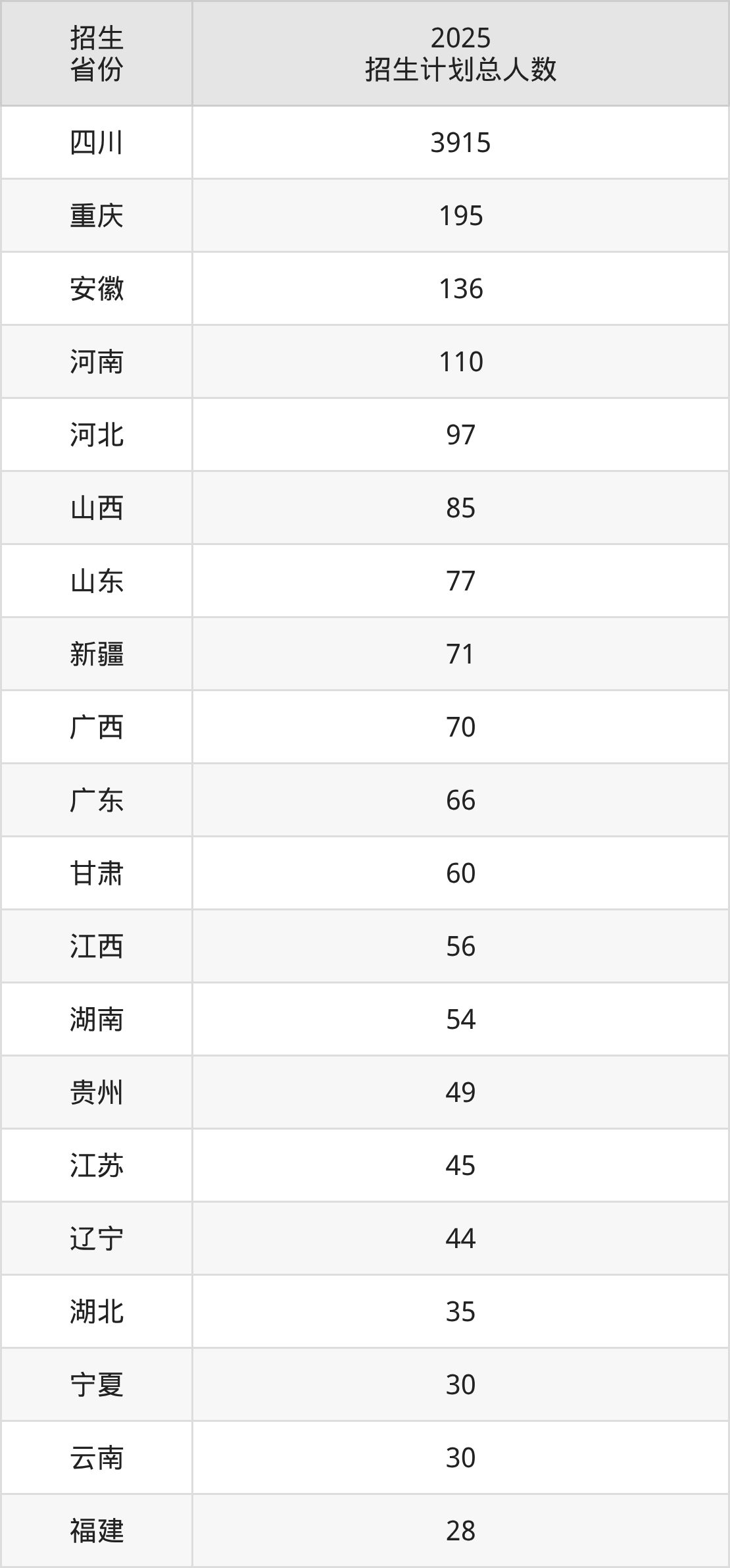 2025年成都信息工程大学面向全国29个省市开展本科招生;招生专业共50个,招生人数共5402人。2025年在四川省招生计划总人数是3915人,其中,成都信息工程大学在四川省招生人数最多的是计算机科学与技术。成都信息工程大学在各省具体招生人数情况如下表。